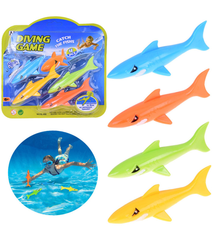 Komplektā ietilpst 4 krāsainas haizivis, aptuveni 12 cm garas un 3 cm platas, izgatavotas no mīkstas, grimstošas gumijas. Rotaļlietas ir patīkamas pieskārienam, tām nav asu malu un tās ir pilnīgi drošas spēlēšanai ūdenī – gan baseinā, gan bērnu baseinā, gan vannā.