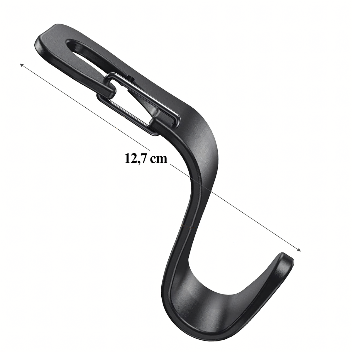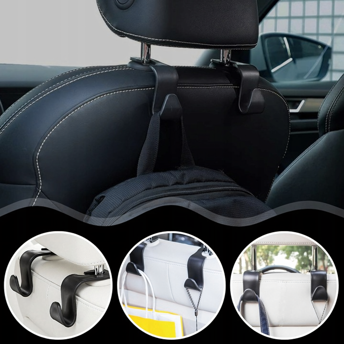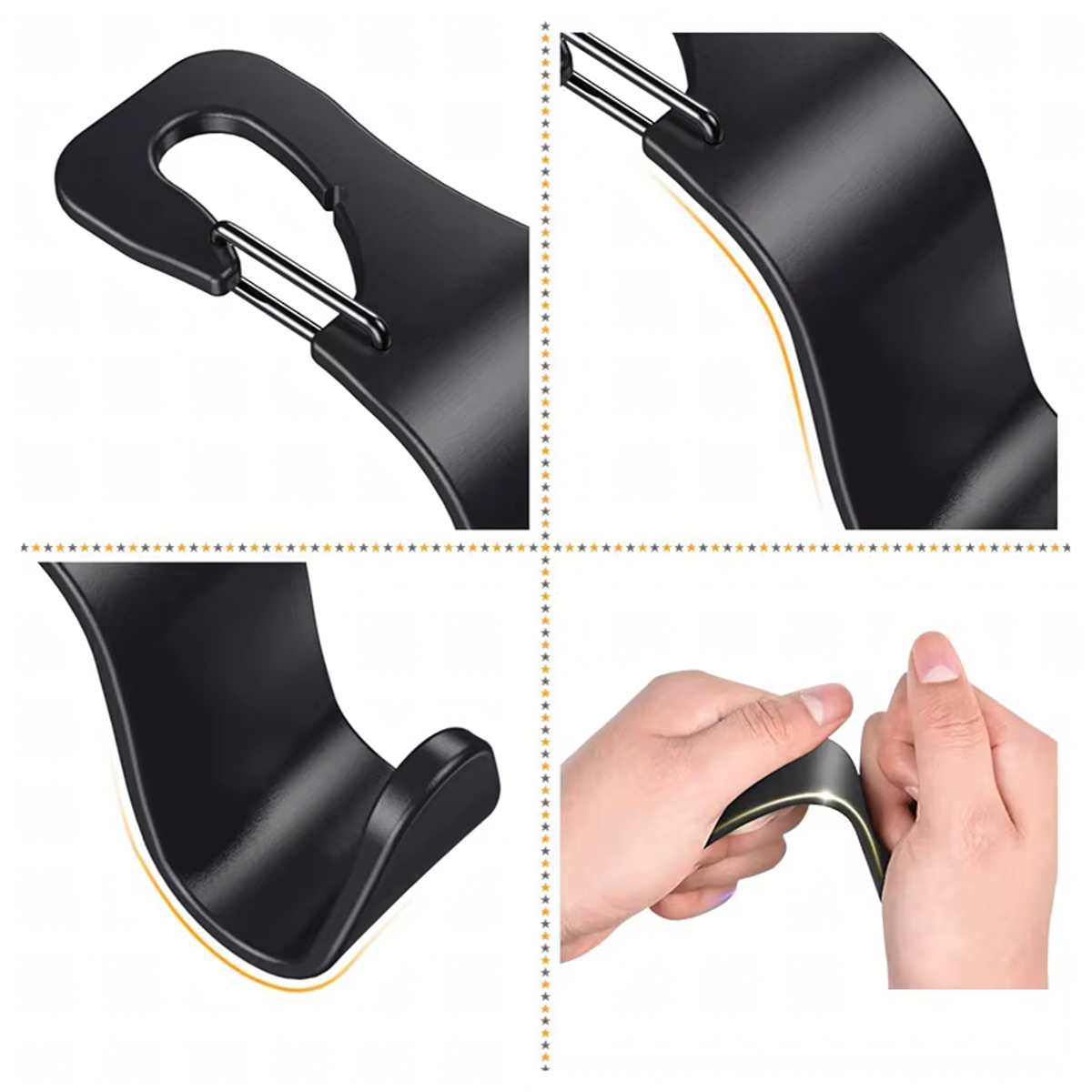 Praktisks komplekts ar 4 stipriem āķiem sēdekļa balsta stiprināšanai ar metāla aizdari, ideāli piemērots ērtai un drošai somu, iepirkumu un aksesuāru glabāšanai automašīnā.