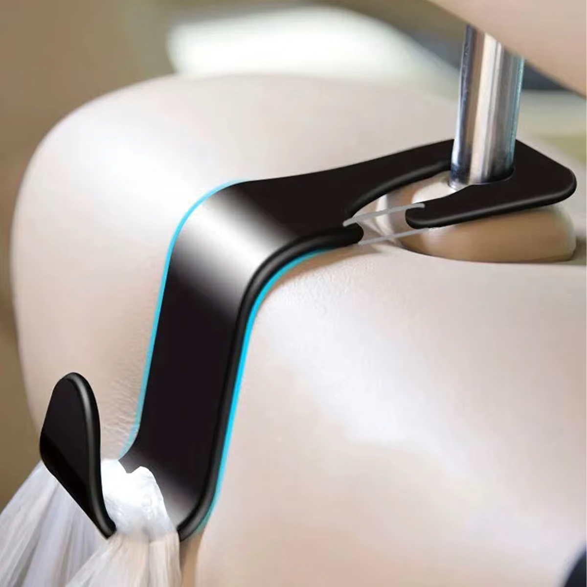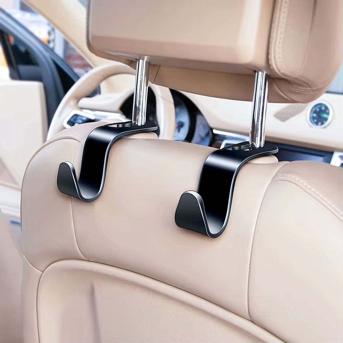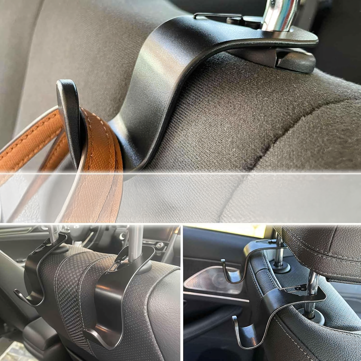 Praktisks komplekts ar 4 stipriem āķiem sēdekļa balsta stiprināšanai ar metāla aizdari, ideāli piemērots ērtai un drošai somu, iepirkumu un aksesuāru glabāšanai automašīnā.