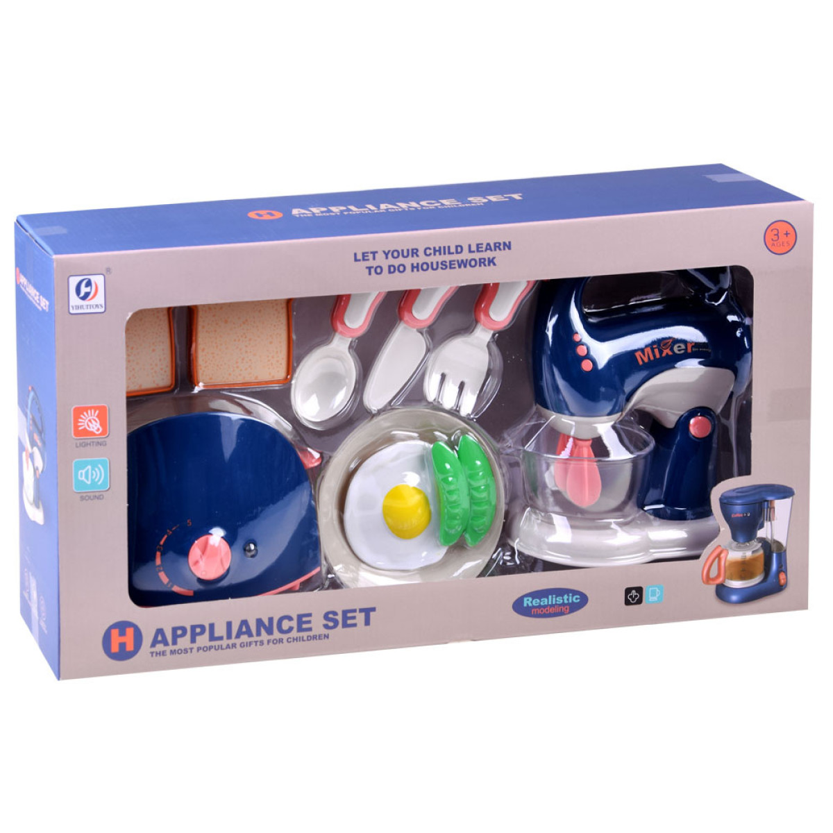 Mikseris un tosteris ir izgatavoti no plastmasas, maigā krāsā, kas lieliski iederēsies jebkurā virtuvē. Tie tiek darbināti ar baterijām (bateriju nodalījums mikserī atrodas apakšā, pēc tā noņemšanas no statīva). Darbības laikā ieslēdzas diode, kas norāda uz ierīces darbību, un rotaļlietas izstaro reālistisku skaņu. Mikserim komplektā ir statīvs, kas ļauj mazajiem pavāriem būt brīviem, ja nejauši sāk dedzināt grauzdiņus.