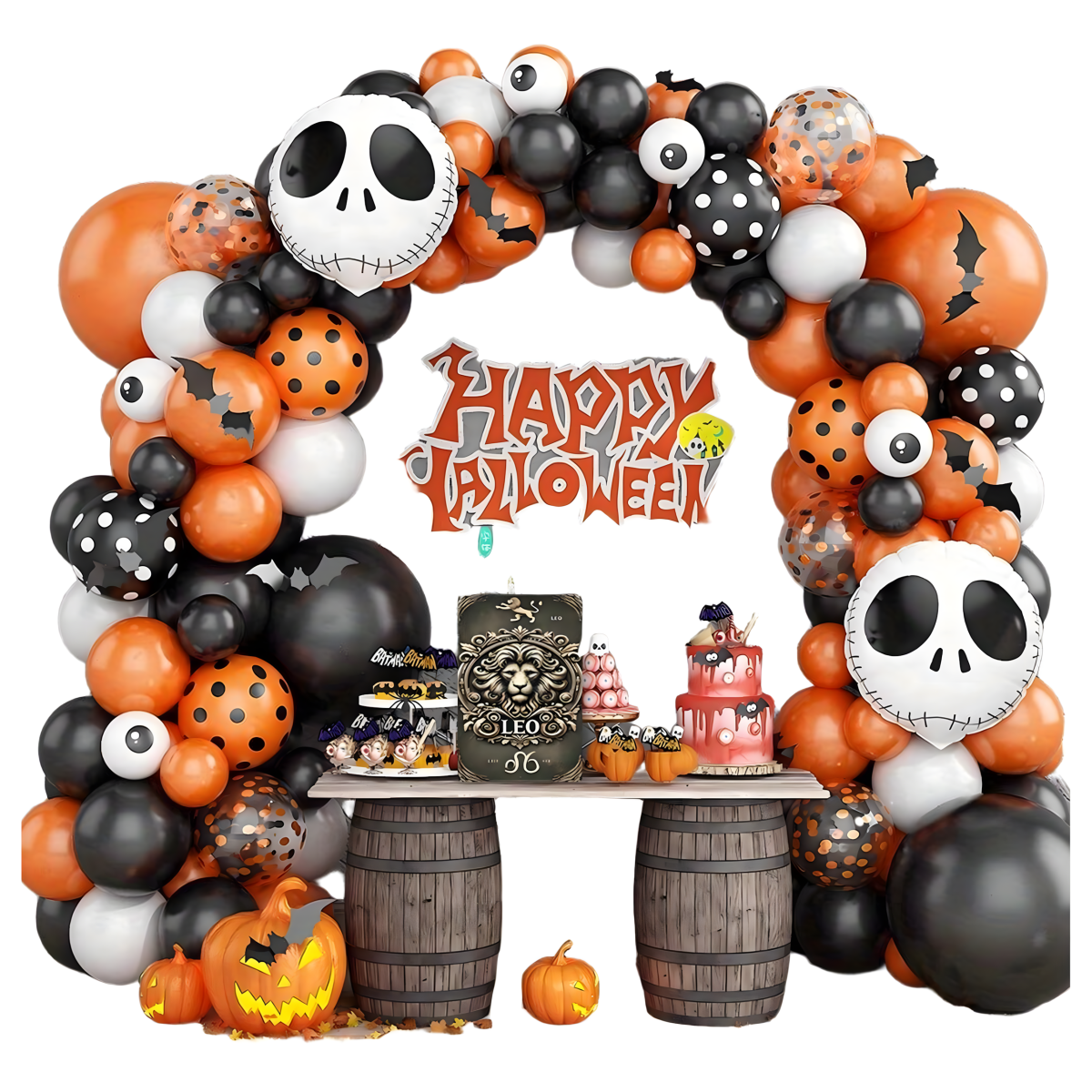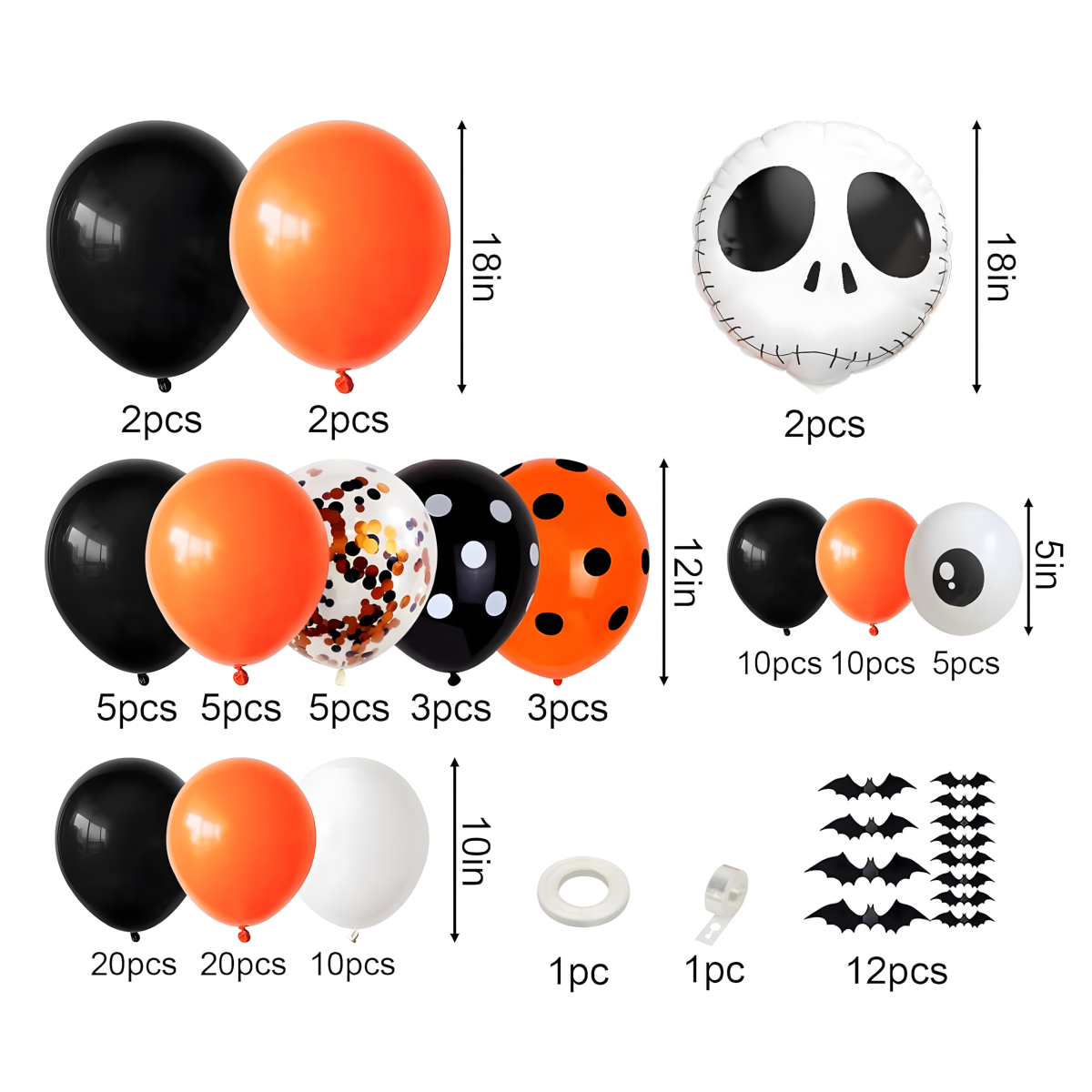 116 elementu haleweenu balonu girlandes komplekts ar galvaskausa motīvu – ideāls dekorācijai svinībām, pasākumiem un fotosesijām. Komplektā ietilpst baloni atmosfēras krāsās, galvaskausi un piederumi vieglai uzstādīšanai, veidojot efektīvu, tumšu noformējumu jūsu haleweenu svinībām.