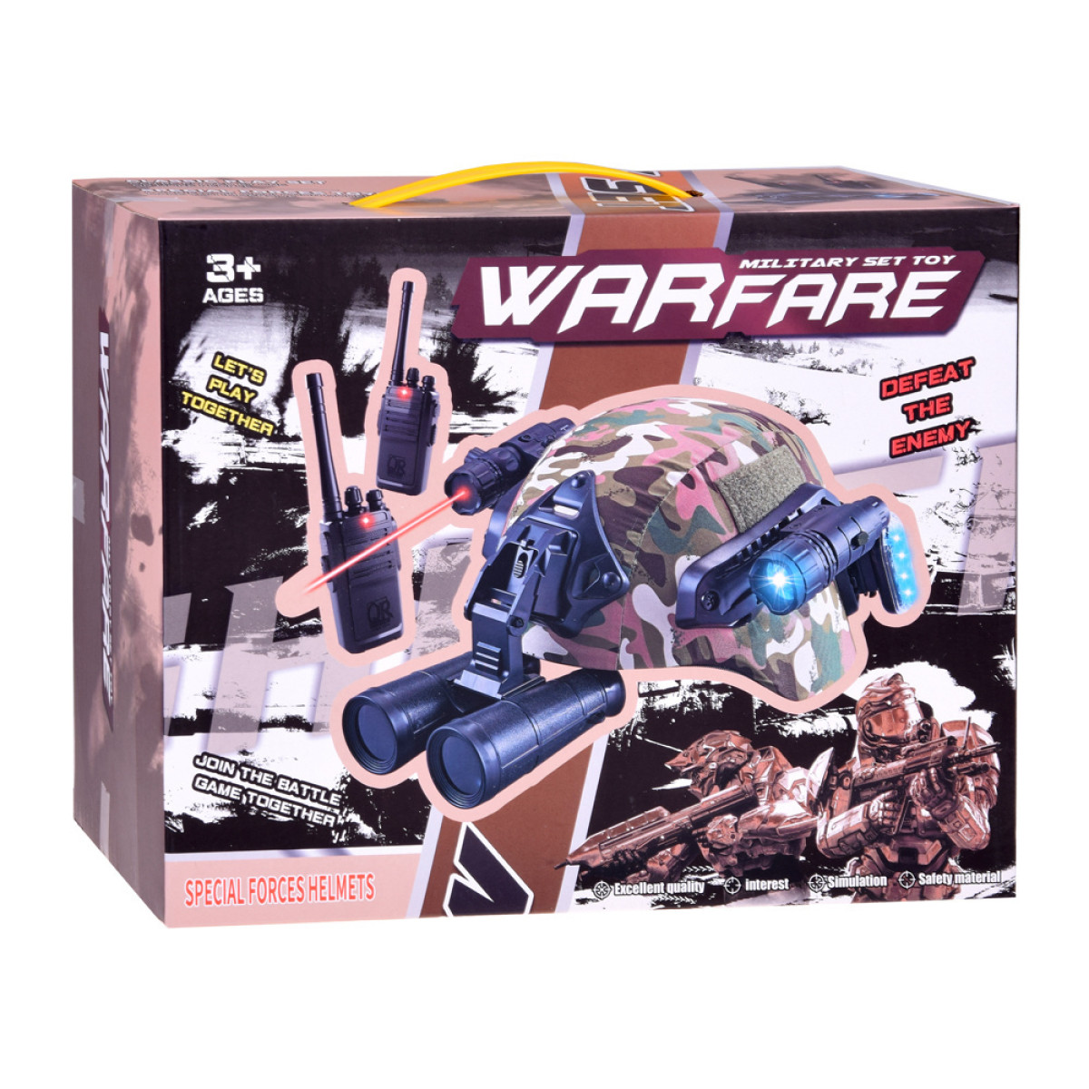 - reālistiska spēle – ķivere un piederumi palīdz bērnam iejusties karavīra lomā