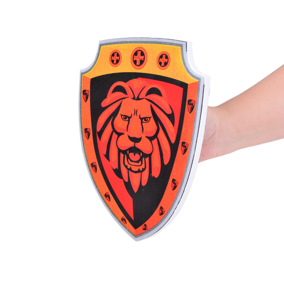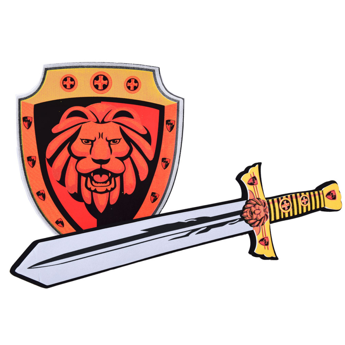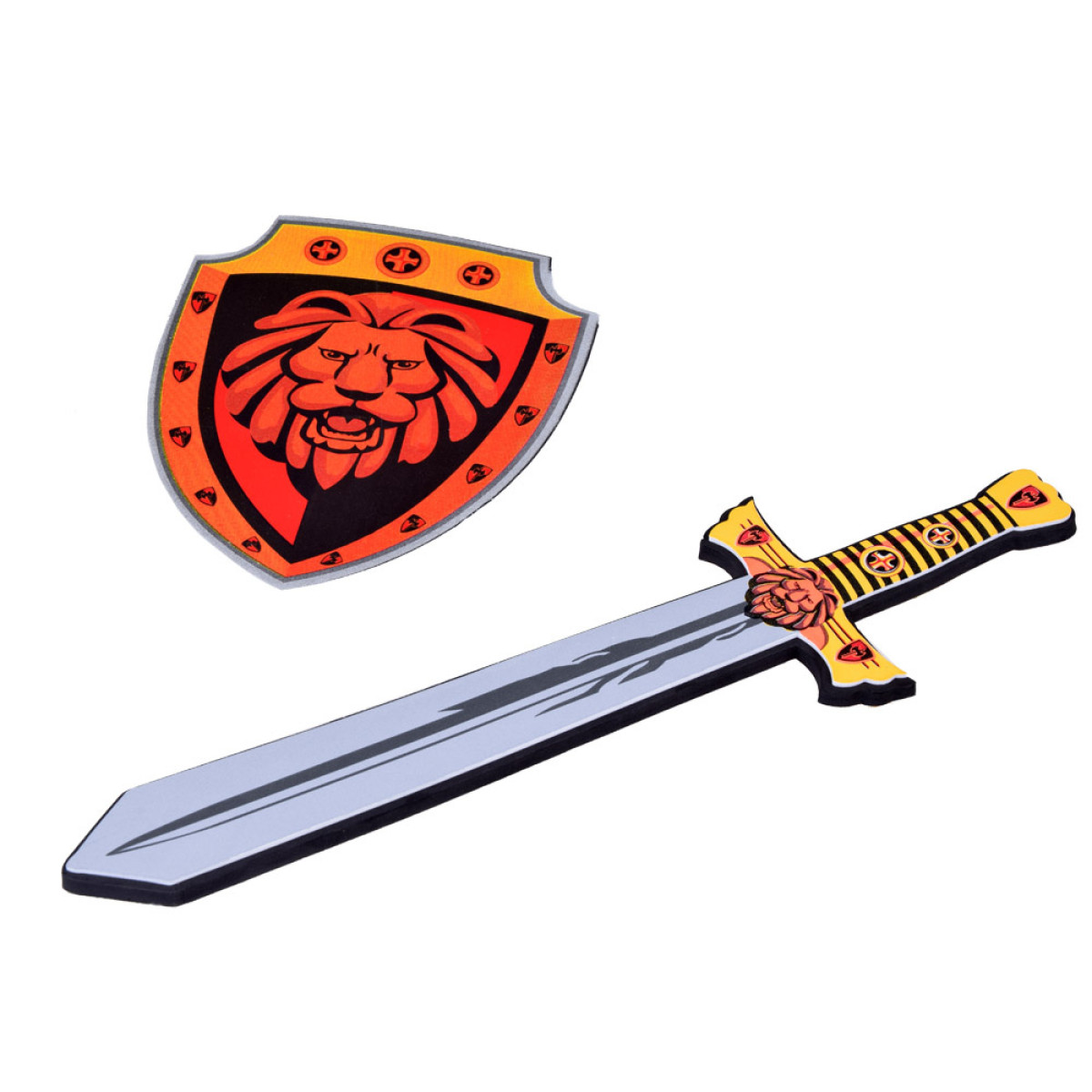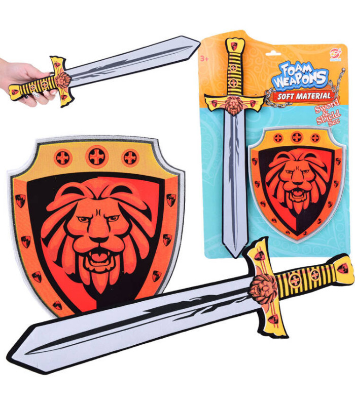 Bērnu zobens un vairogs, izgatavoti no drošas putas. Piesaista ar savām krāsām un izskatu. Šī mīkstā un elastīgā konstrukcija nodrošina ne tikai enerģisku spēli, bet arī garantē drošību, novēršot nobrāzumus un sāpīgus triecienus. Tagad jūsu bērns var iejusties bruņinieka lomā un meklēt princesi. Šis komplekts ir lielisks bruņinieka vai karaļa tērpa papildinājums un palīdzēs attīstīt intereses un kaislības. Ideāls papildinājums karnevāla ballēm un teātra izrādēm. Komplekts ir ideāls turnīru spēlēm. Lauvas motīvs uz vairoga un zobena noteikti stimulēs jūsu bērna iztēli! Ar šo komplektu jūsu mazulis varēs parādīt īsta bruņinieka īpašības, piemēram, drosmi un godu!