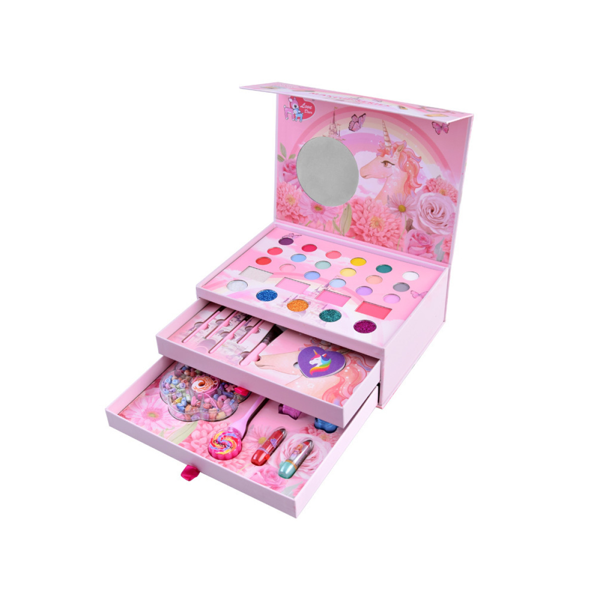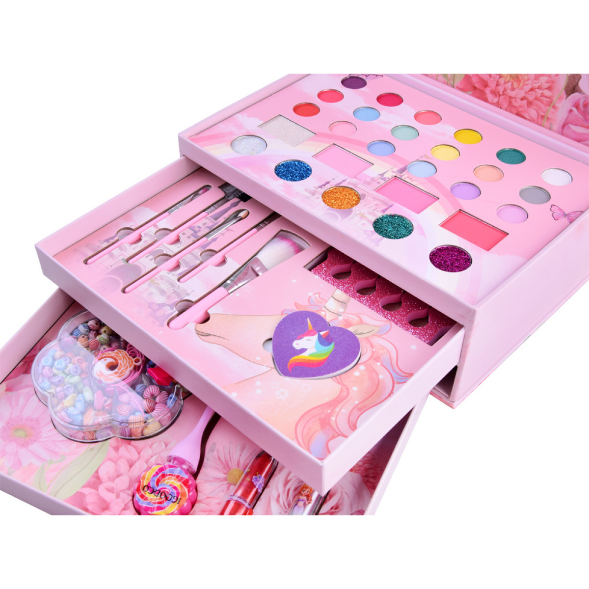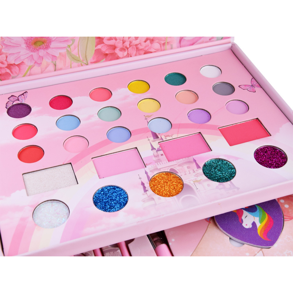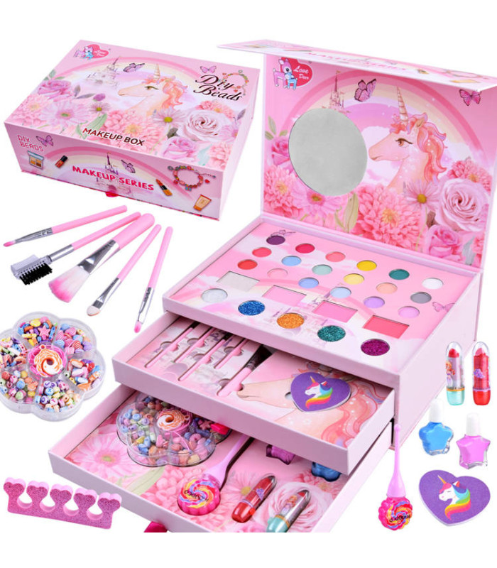 fantastisks grima komplekts meitenēm, kurām patīk mode, stils un radošas pārvērtības. visi elementi ir ievietoti skaistā koferītī no bieza kartona rozā krāsā ar ziedu, vienradžu un tauriņu motīviem.