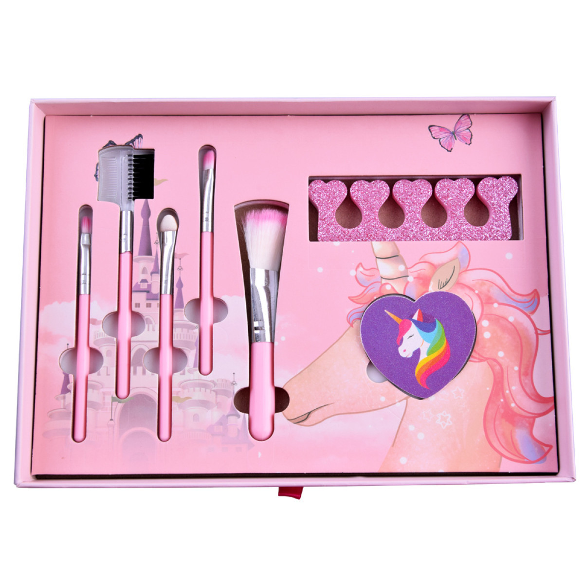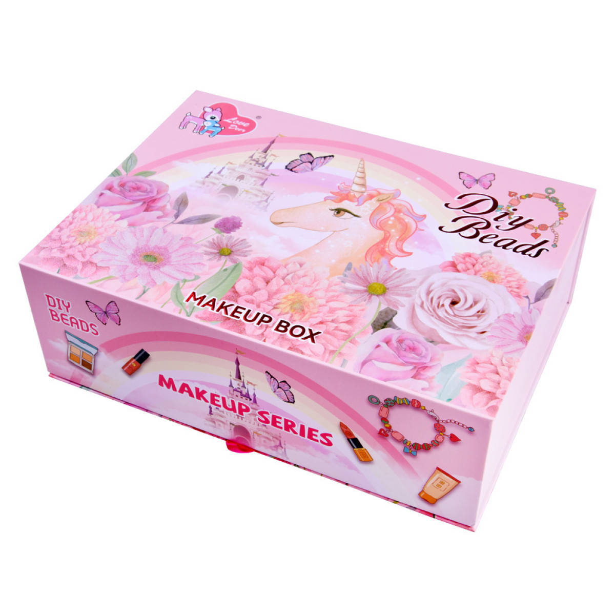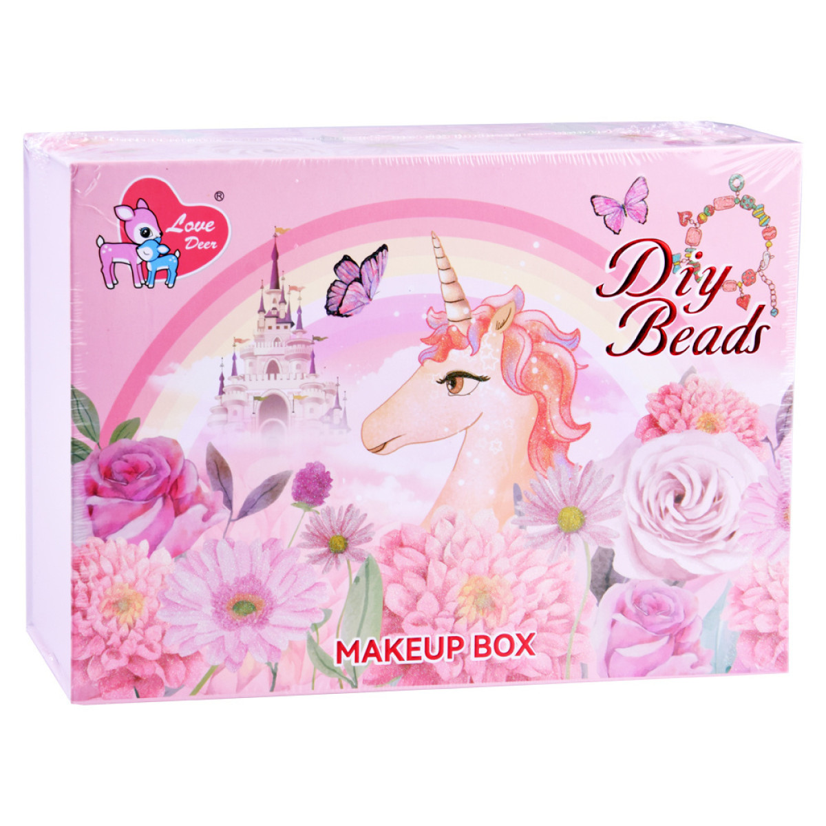 fantastisks grima komplekts meitenēm, kurām patīk mode, stils un radošas pārvērtības. visi elementi ir ievietoti skaistā koferītī no bieza kartona rozā krāsā ar ziedu, vienradžu un tauriņu motīviem.