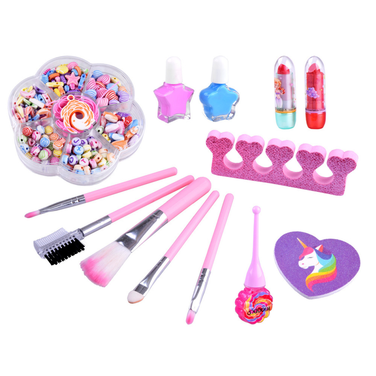 komplekts ir piemērots arī vecākai meitenei, kura vēlas pati izveidot grimu svētkiem vai īpašiem notikumiem. tas lieliski noder arī rotaļām vizāžistes lomā. papildus komplektā ir krāsainas dažādu formu pērlītes, no kurām var izveidot kaklarotu vai rokassprādzi, lai papildinātu izvēlēto tēlu.