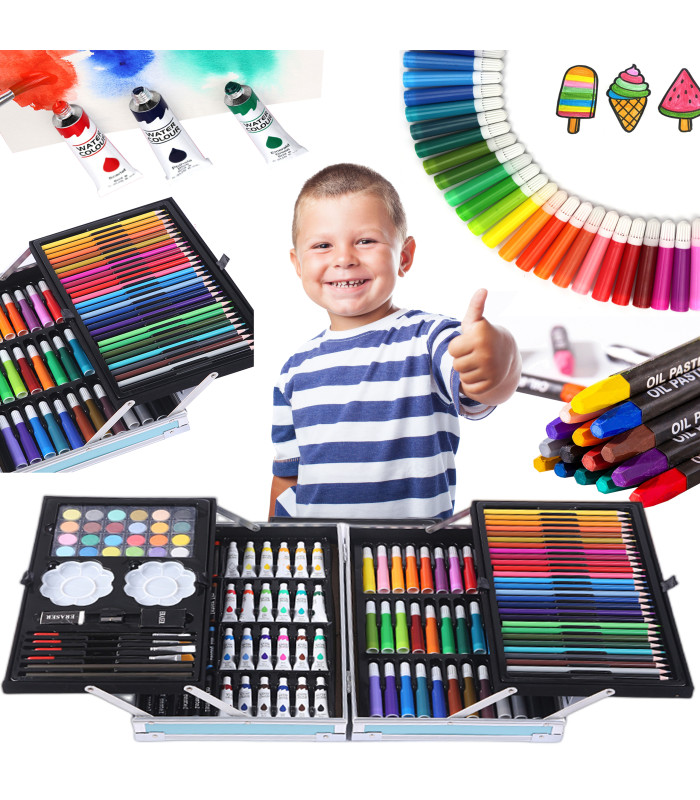 Mākslas komplektācija bērniem ar 145 elementiem un praktisku koferi. Iegremdējieties mākslas pasaulē ar mūsu pilnīgo komplektu, kurā ir krītiņi, krāsas un marķieri. Ļaujiet vaļu savai iztēlei, radiet un attīstiet savas mākslinieciskās prasmes!