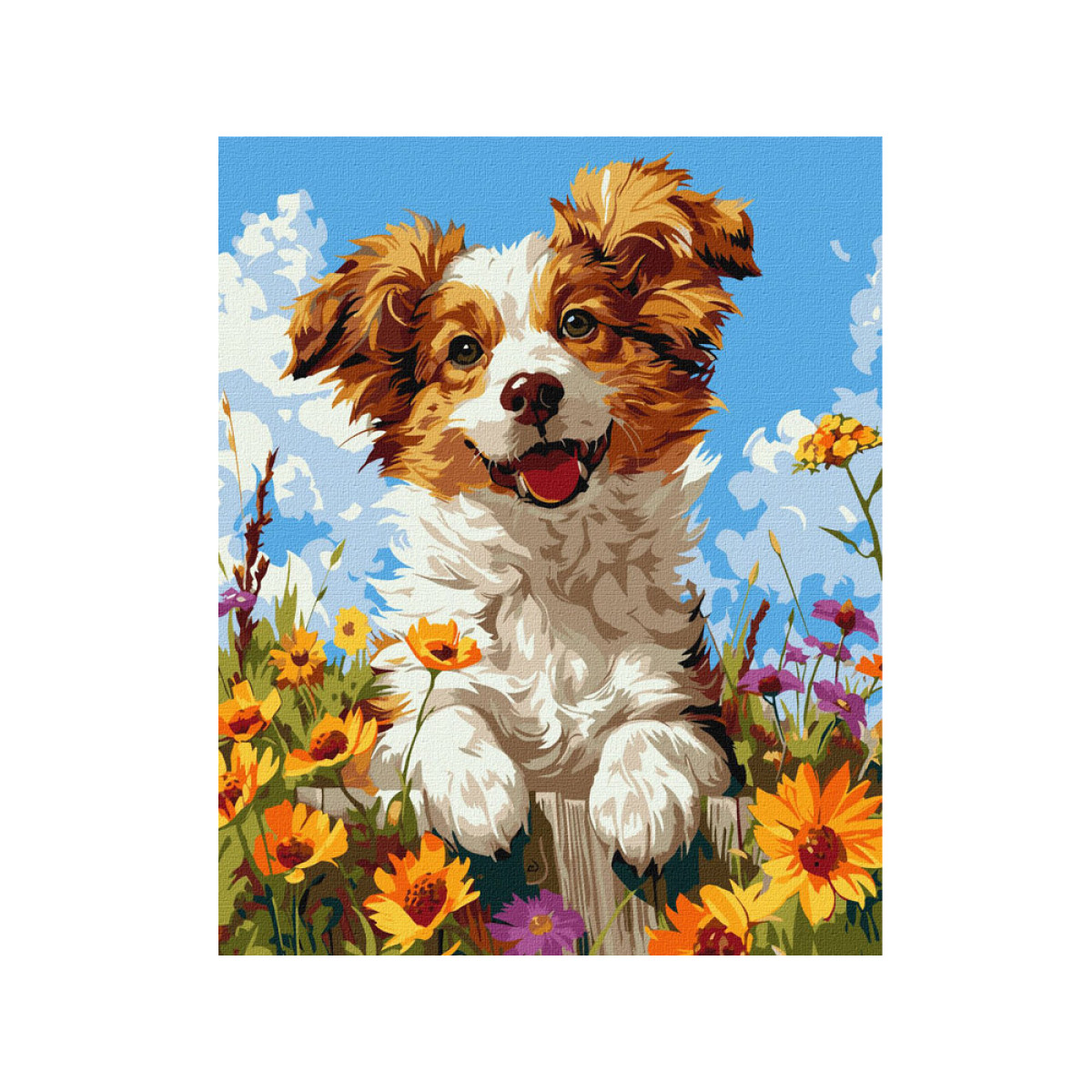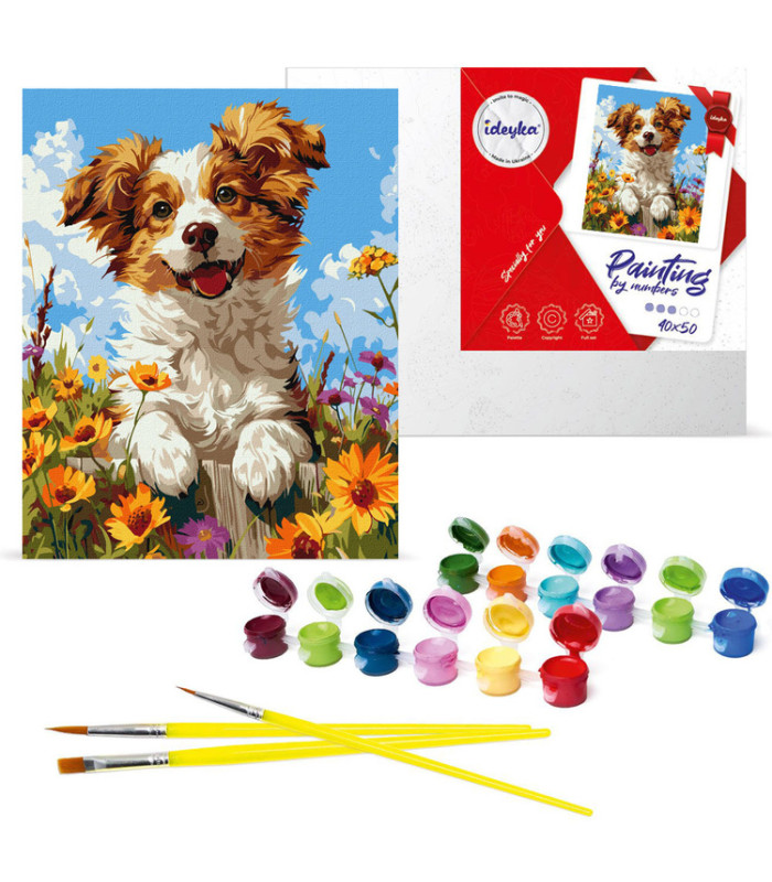 - Gatavs gleznošanai audekls ar elegantu motīvu "Suns ziedos", sadalīts numurētās lauciņās