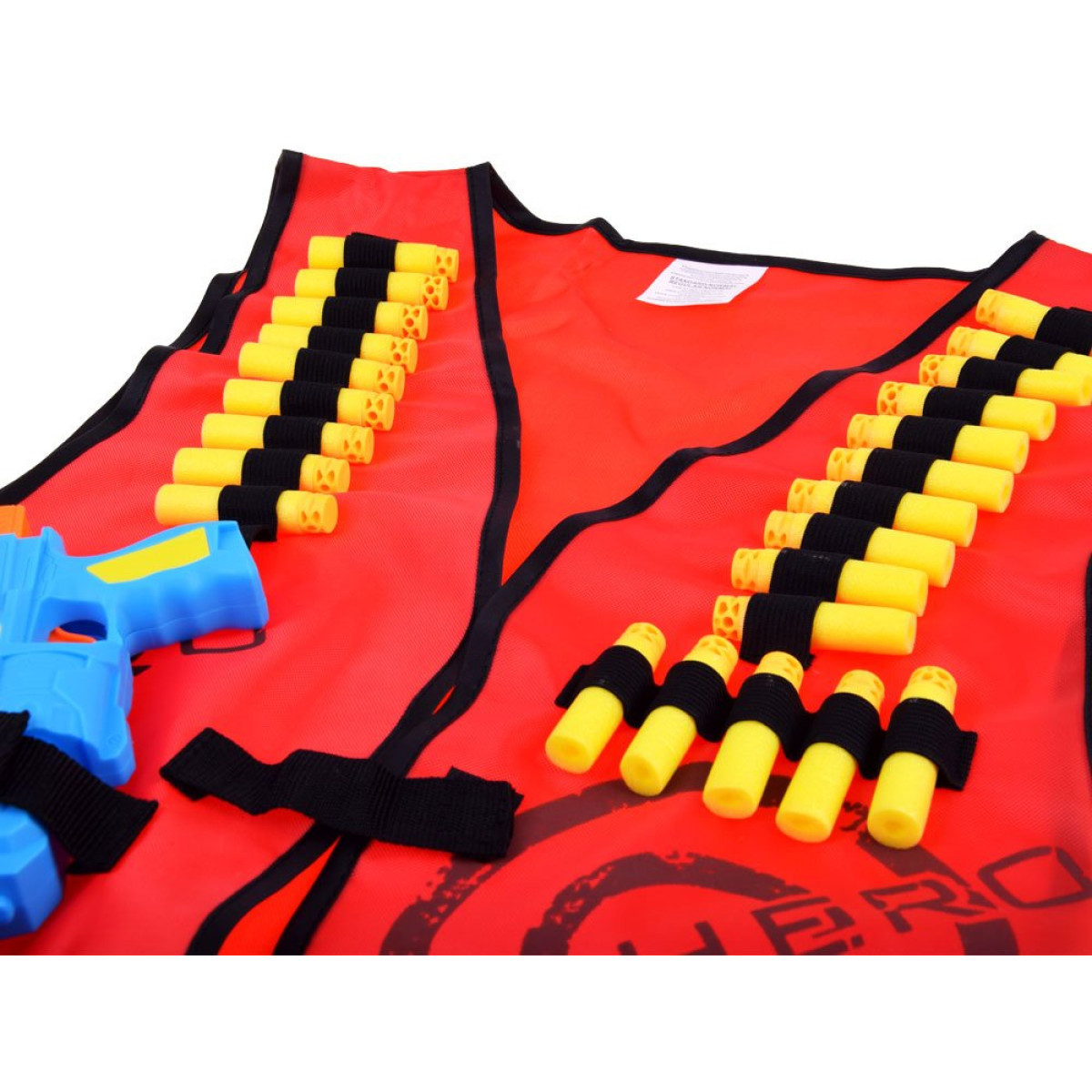 Fantastisks kamuflāžas veste un pistoles komplekts nodrošina katram mazajam karotājam priekšrocības kaujas laukā. Pateicoties vestei ar papildus šāviņu vietām, jūsu bērns būs gatavs katram izaicinājumam, bet viņa pretinieki būs bez izredzēm!