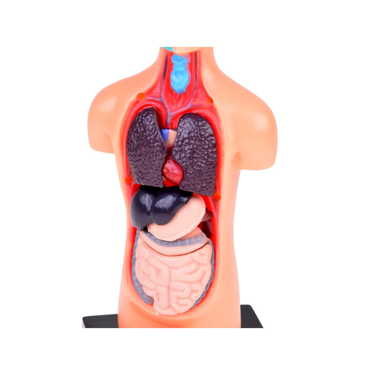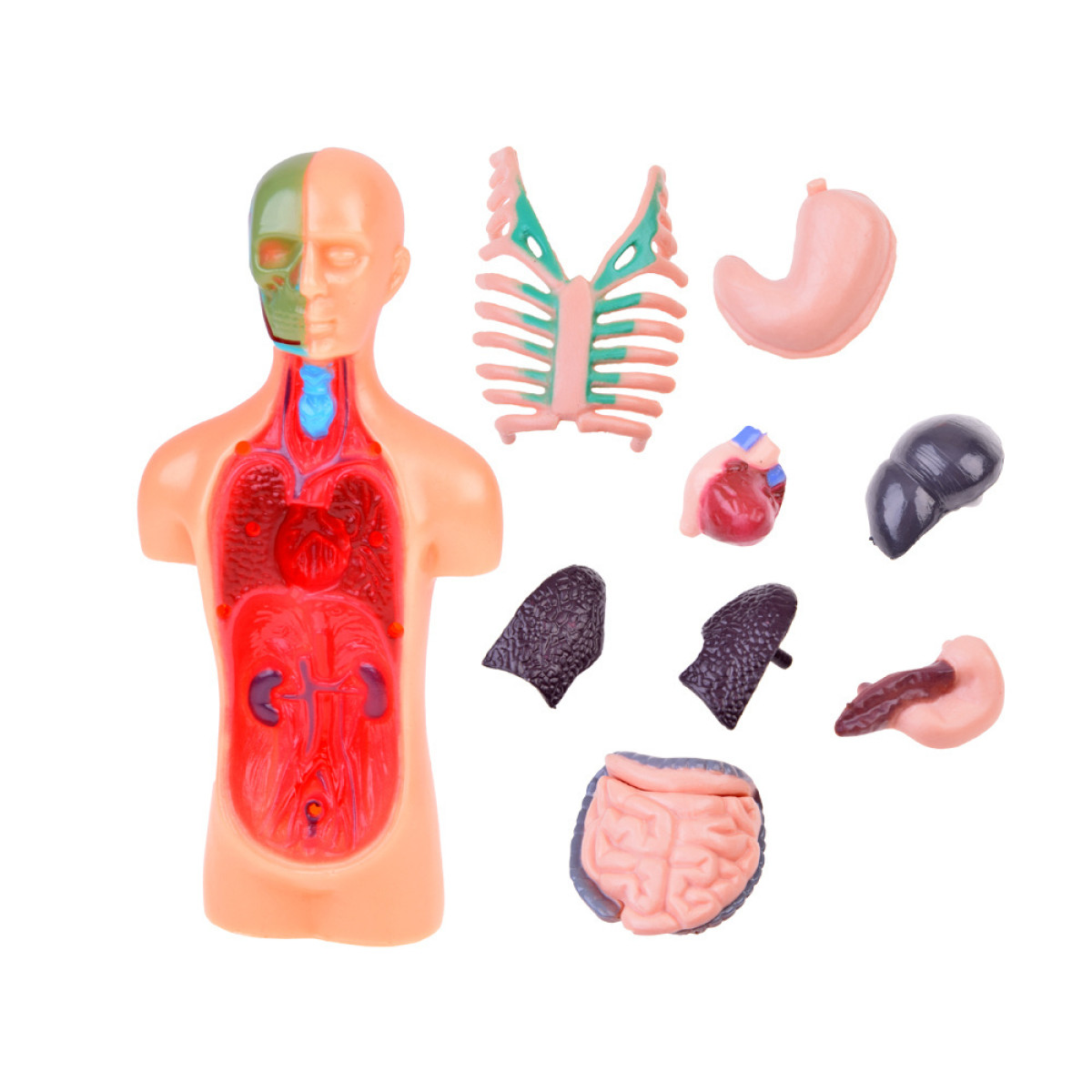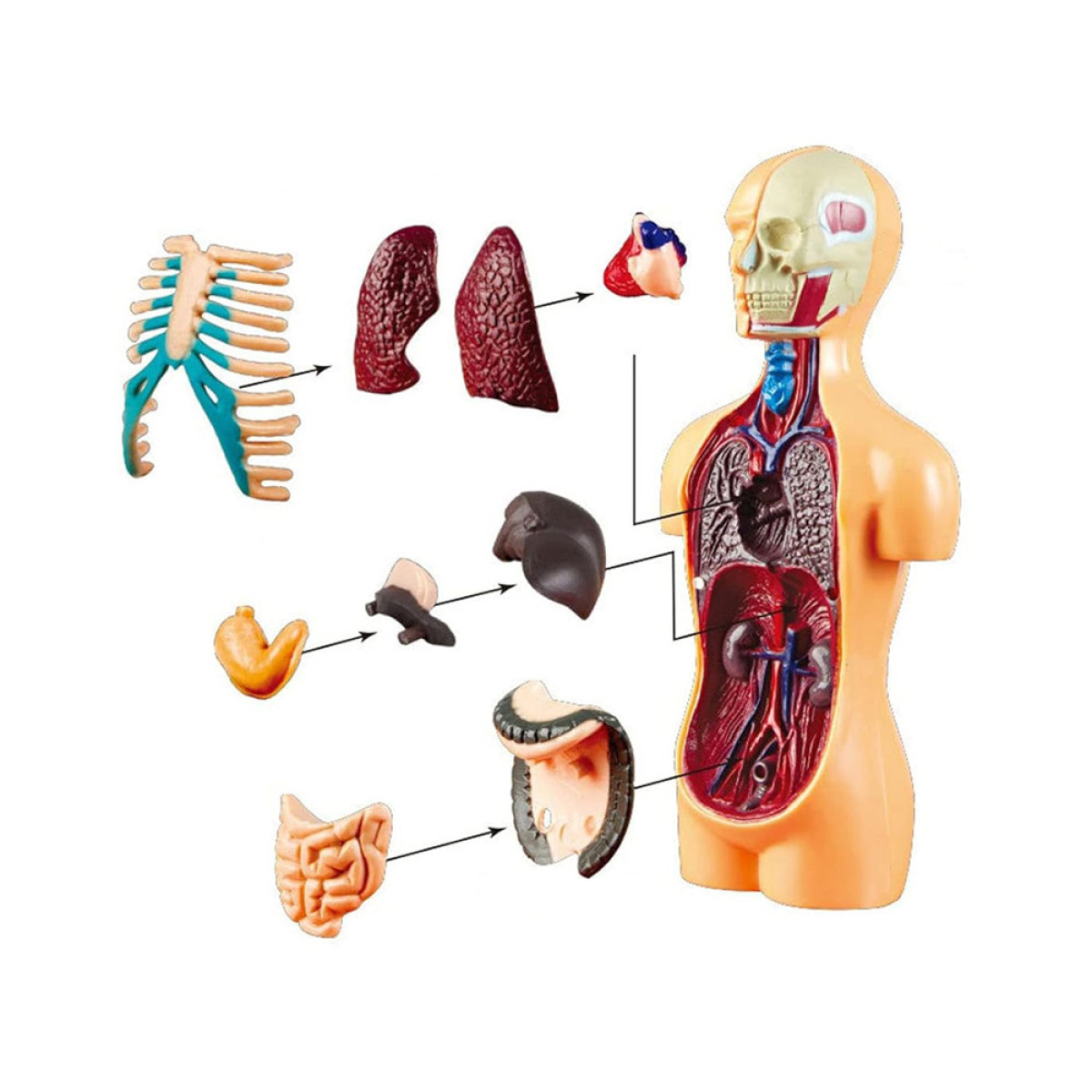 - Izņemami orgāni – modelis ir aprīkots ar izņemamiem orgāniem, piemēram, sirdi, plaušām, aknām, kuņģi, aizkuņģa dziedzeri, resno un tievo zarnu, kas ļauj detalizēti iepazīties ar to struktūru un savstarpējām saitēm. Tas atvieglo mācīšanos un izpratni par dažādu orgānu funkcijām ķermeņa sistēmā.
