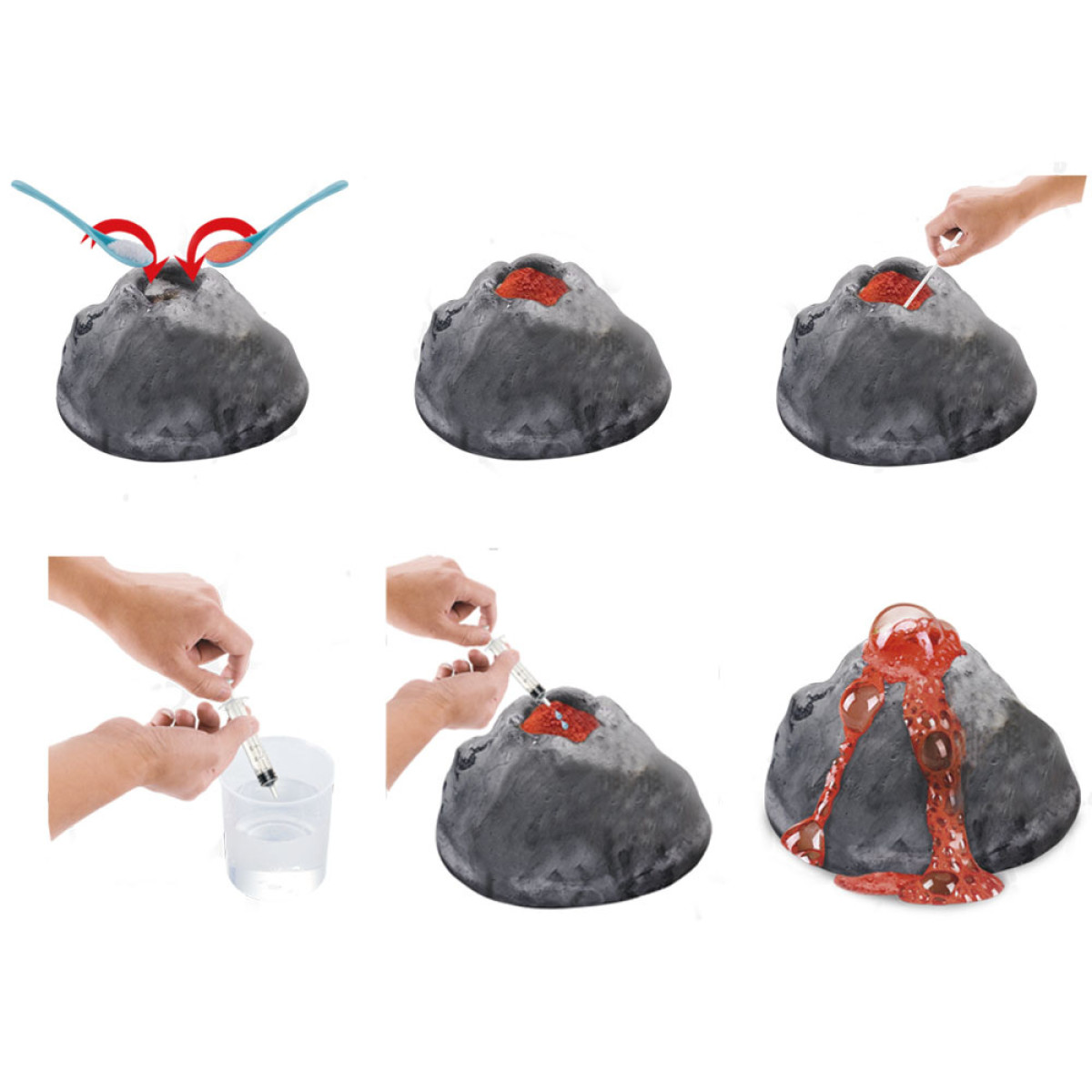 - Piepildiet mērvienības kausiņu ar ūdeni un pēc tam uzpildiet šļirci. Ar šļirci uzmanīgi ievietojiet ūdeni vulkāna krāterī, lai rokas nesaskartos ar veidni.
