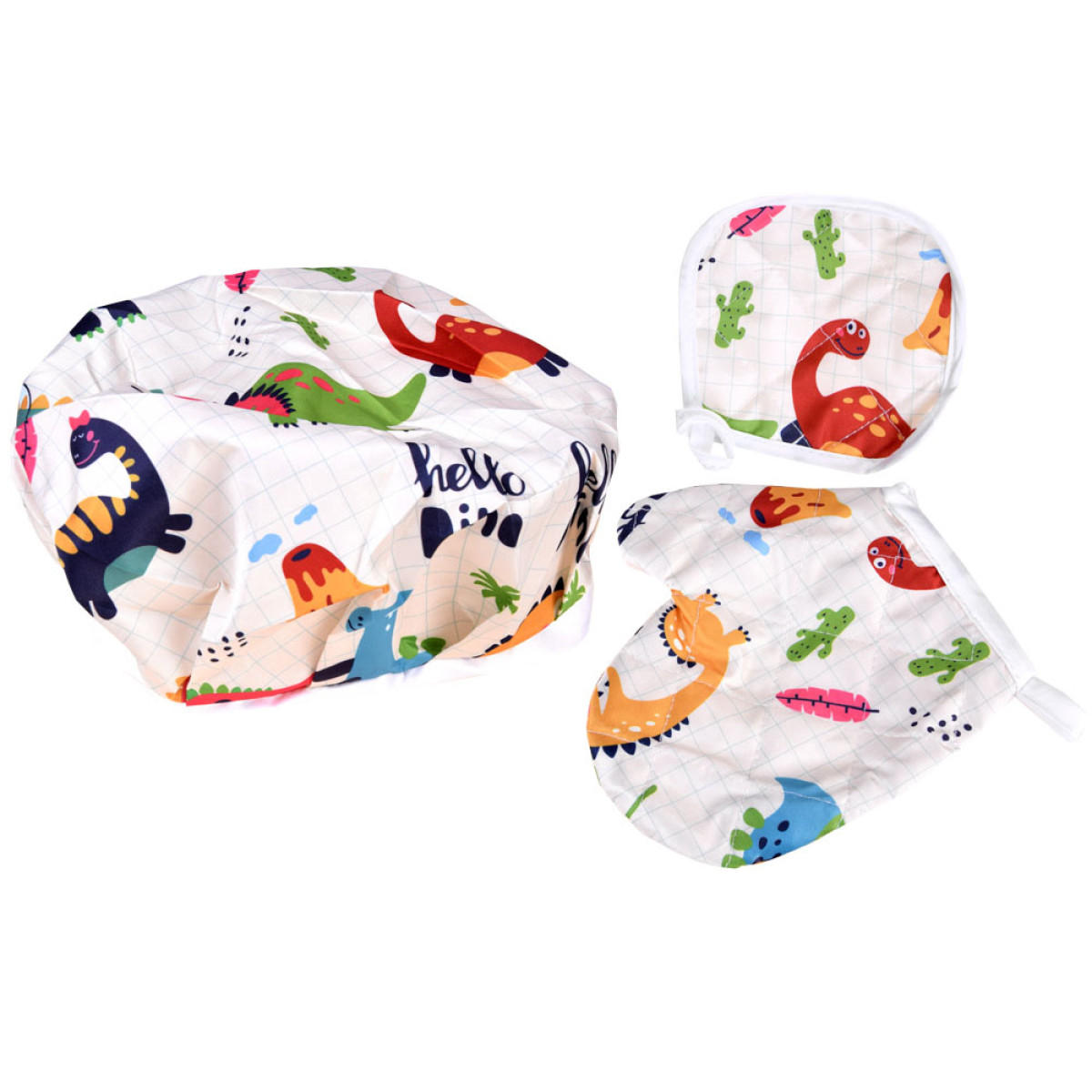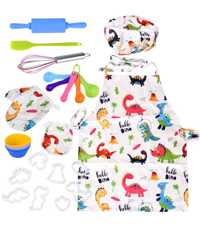 Burvīgs komplekts jaunajiem pavāriem, priekšauts ar dinozauriem, kas paredzēts jebkuram bērnam, kurš vēlas palīdzēt virtuvē. Tas ir piemērots jebkurā mājsaimniecībā.