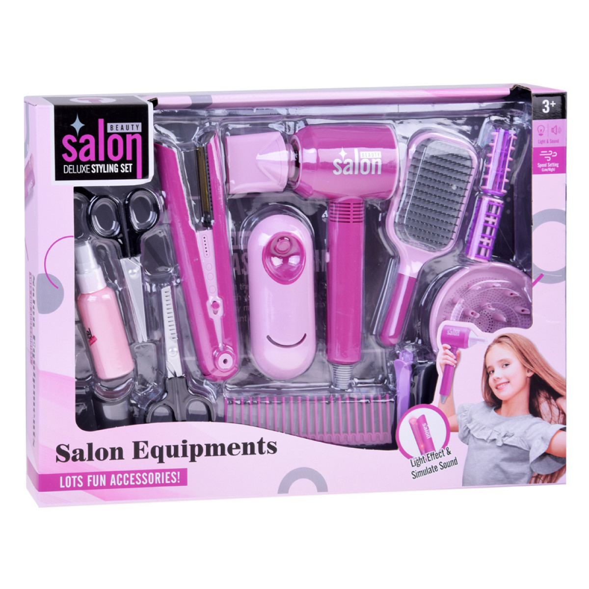 Visi komplekta elementi ir rozā-violetā krāsā, lieliski piemēroti jebkurai meitenes tualetes galdiņai. Fēns darbojas ar baterijām (3 x AAA - nav iekļautas), padarot spēli vēl interesantāku un reālistiskāku. Fēnam ir divi maināmi uzgaļi, kas pielāgojas dažādām vajadzībām. Bērns var droši spēlēties ar aksesuāriem, jo tiem nav asu malu un tie nesakarst. Šis bagātīgi aprīkotais komplekts noteikti nodrošinās daudzas stundas aizraujošas spēles!
