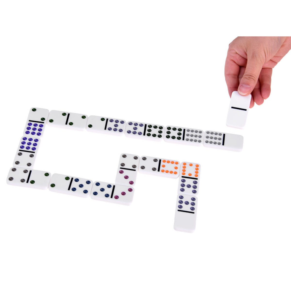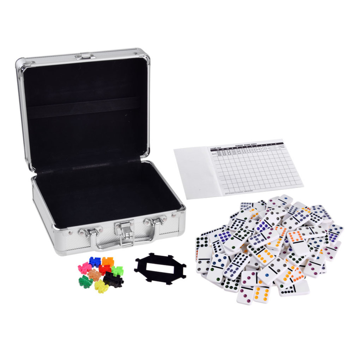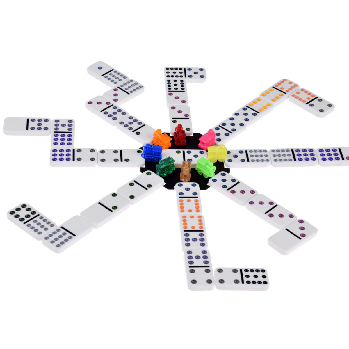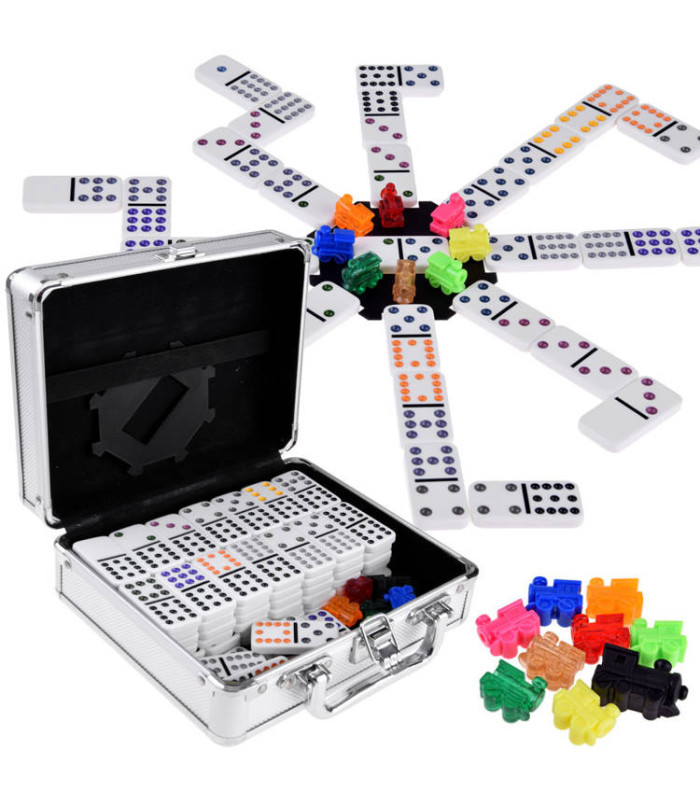 Domino ir viena no senākajām un pazīstamākajām spēlēm pasaulē. Komplektā ietilpst 91 domino flīze un spēles piederumi: punktu skaitīšanas tabula, krāsaini vilcieniņi un zobrats meksikāņu vilciena spēlei.