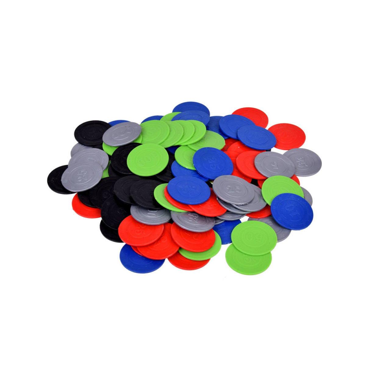 Žetoniem ir dažādas nominālvērtības: 5, 10, 25, 50, 100. Materiāls: plastmasa (žetoni), filcs (laukums), papīrs (kārtis). Izmēri: laukums 58 x 37 cm, žetona diametrs aptuveni 3,5 cm.