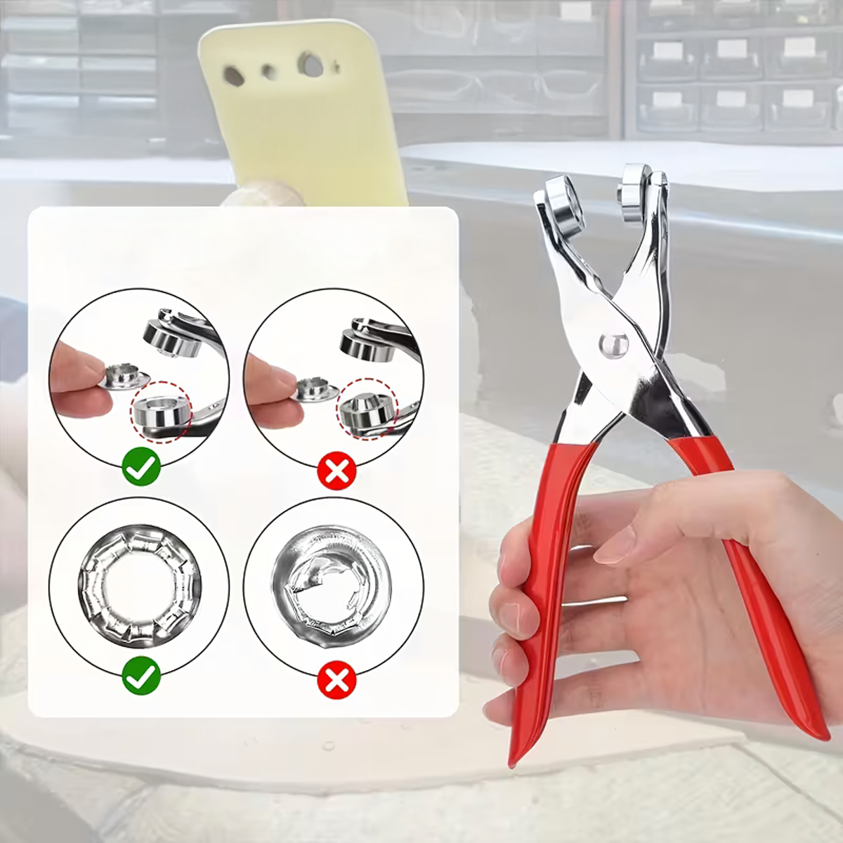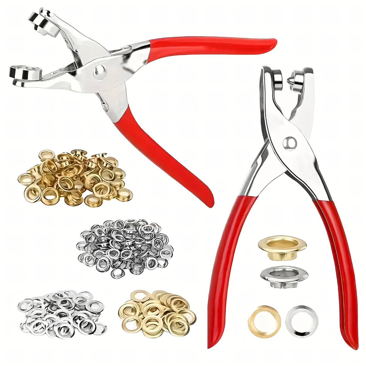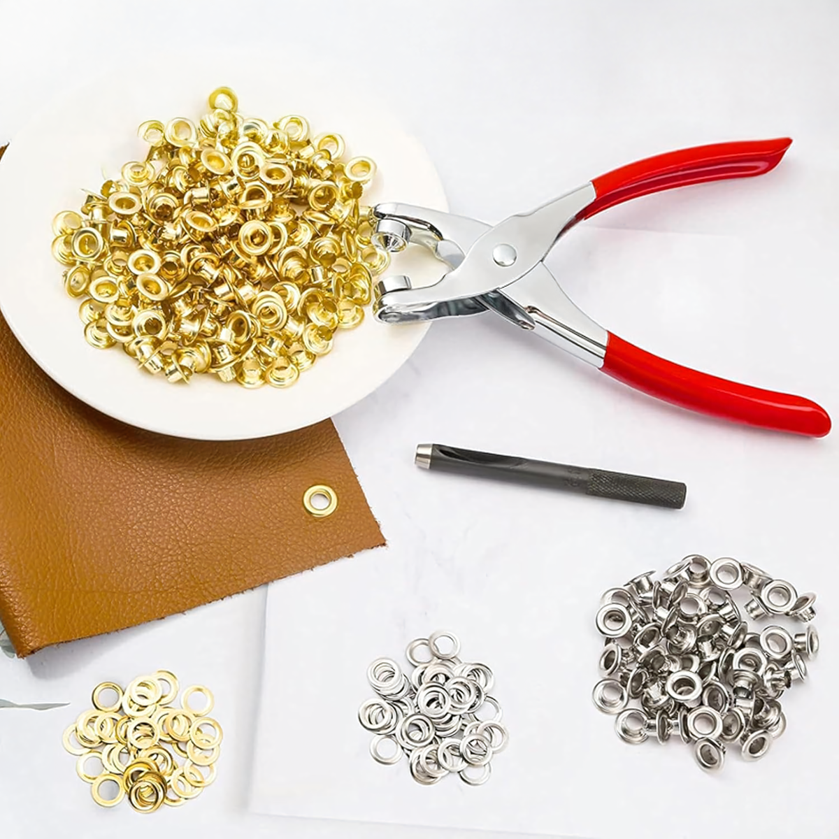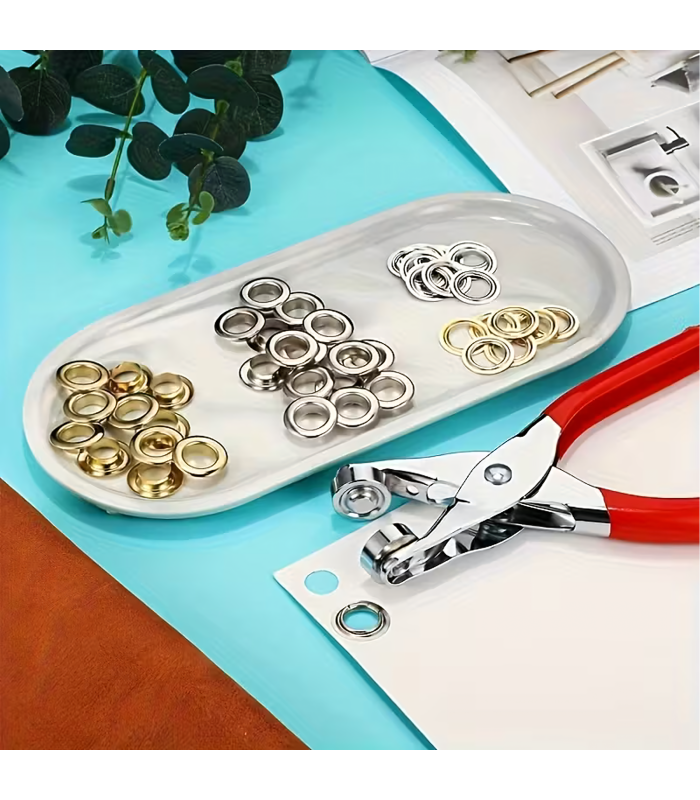 Šis praktiskais komplekts ir ideāls risinājums gredzenu un kniedu uzstādīšanai, kas piemērots gan amatniekiem, DIY entuziastiem, gan ādas izstrādājumu meistariem. Ar perforatora knaiblēm un 100 gredzeniem (sudraba un zelta) viegli stiprināt materiālu un piešķirt tam estētisku izskatu.