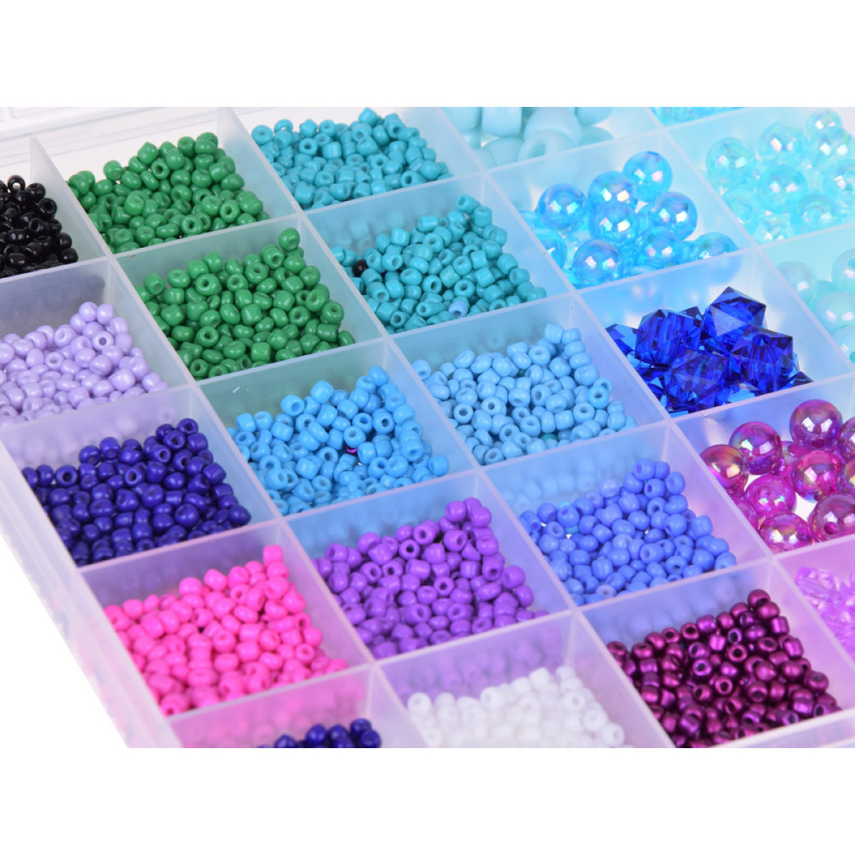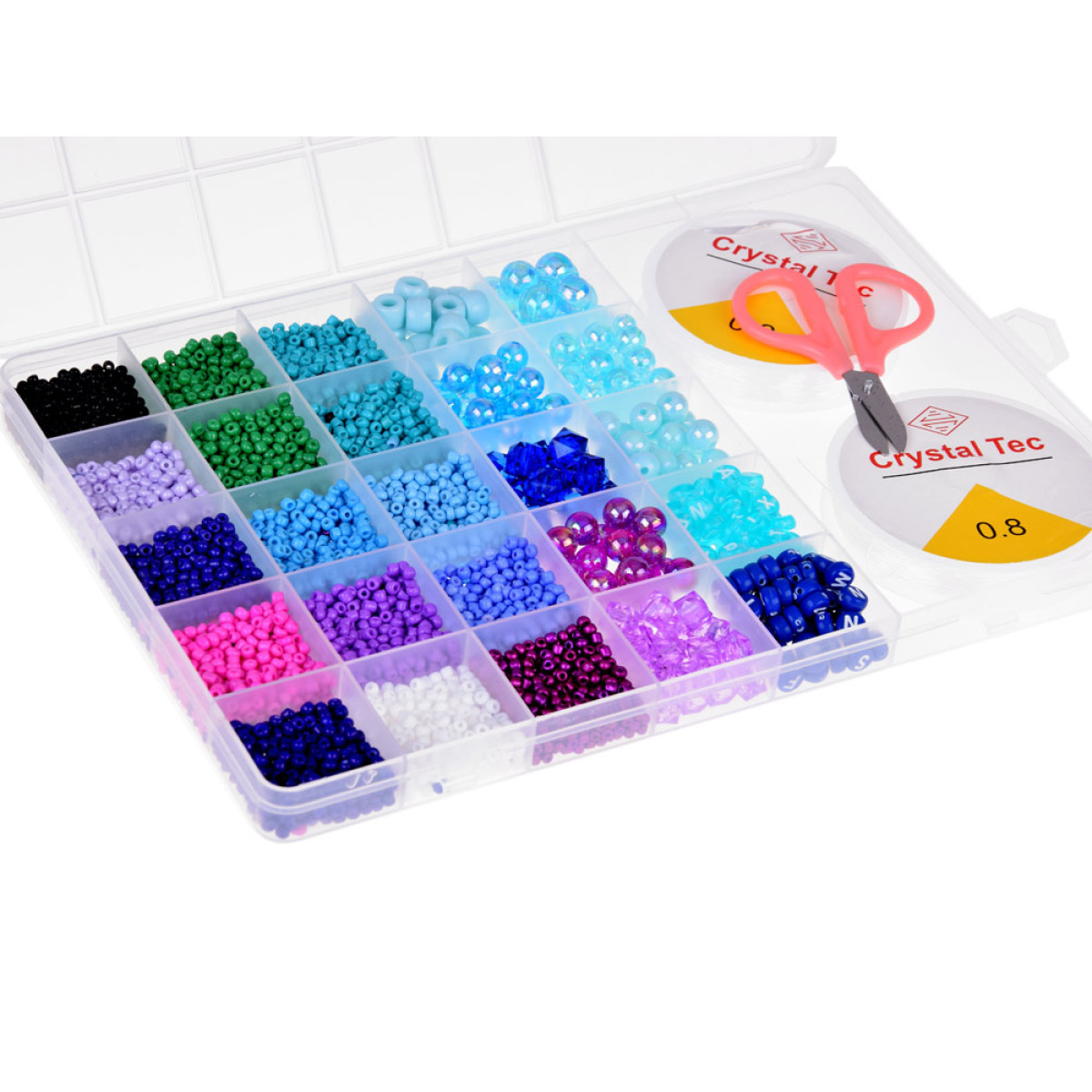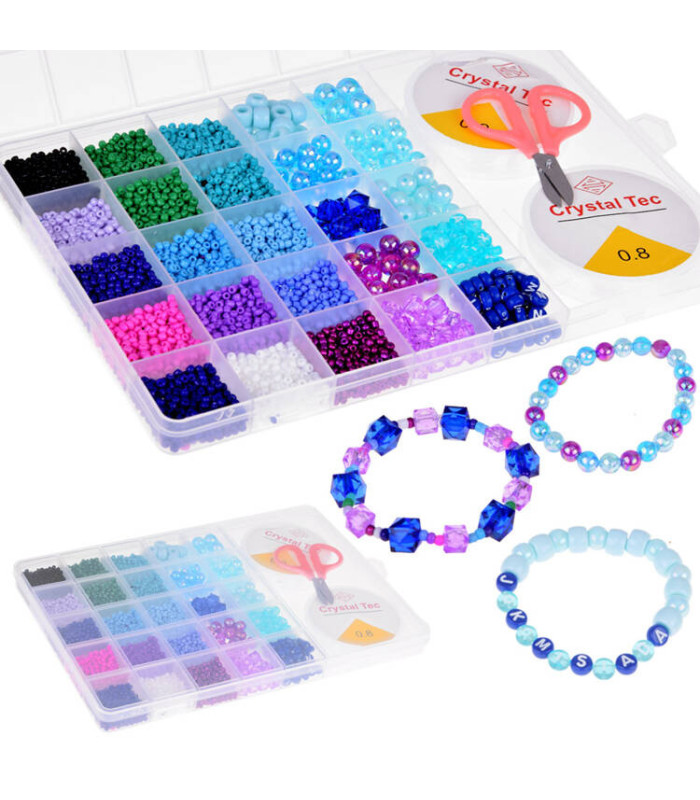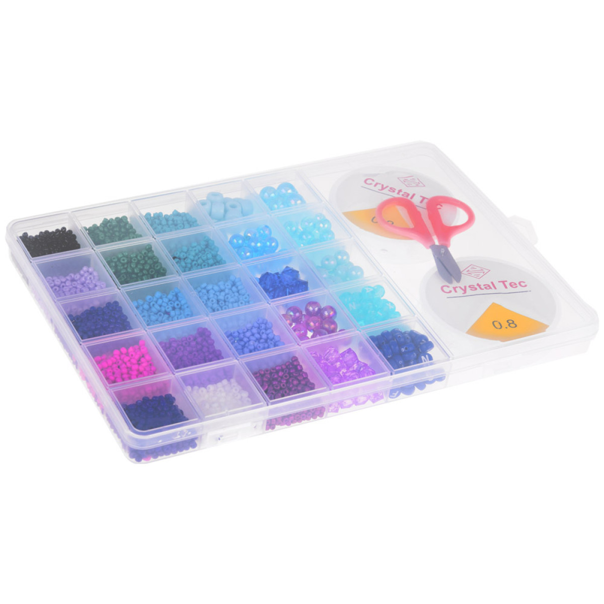 Komplekts ir iepakots praktiskā, caurspīdīgā kastē, kas atgādina koferīti, sadalītu nodalījumos, lai novērstu krellīšu sajaukšanos.