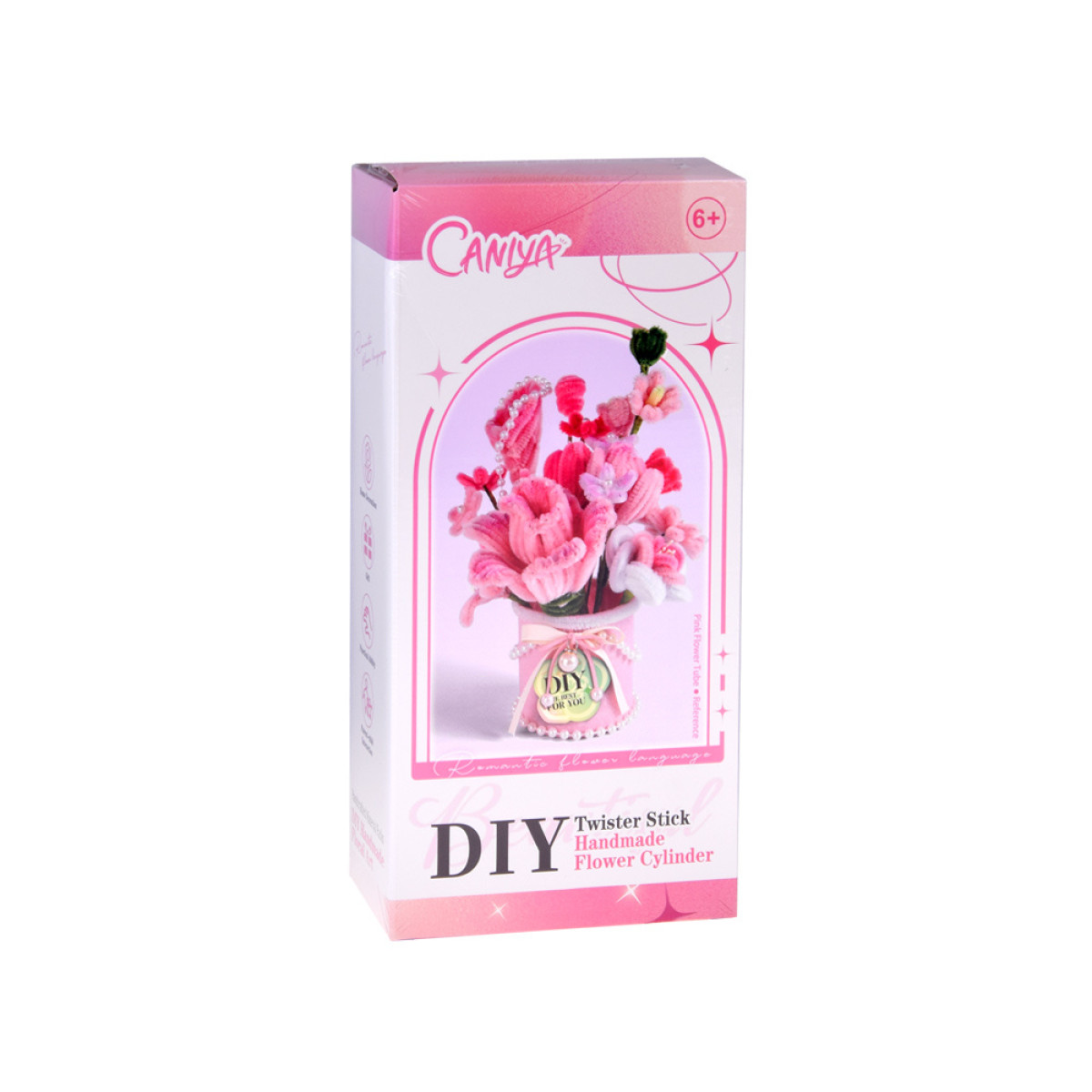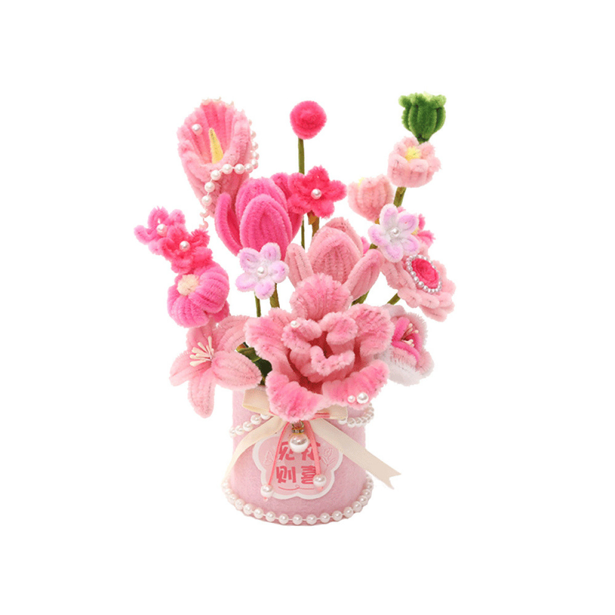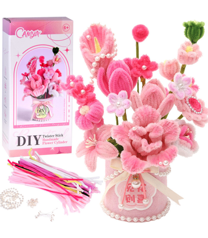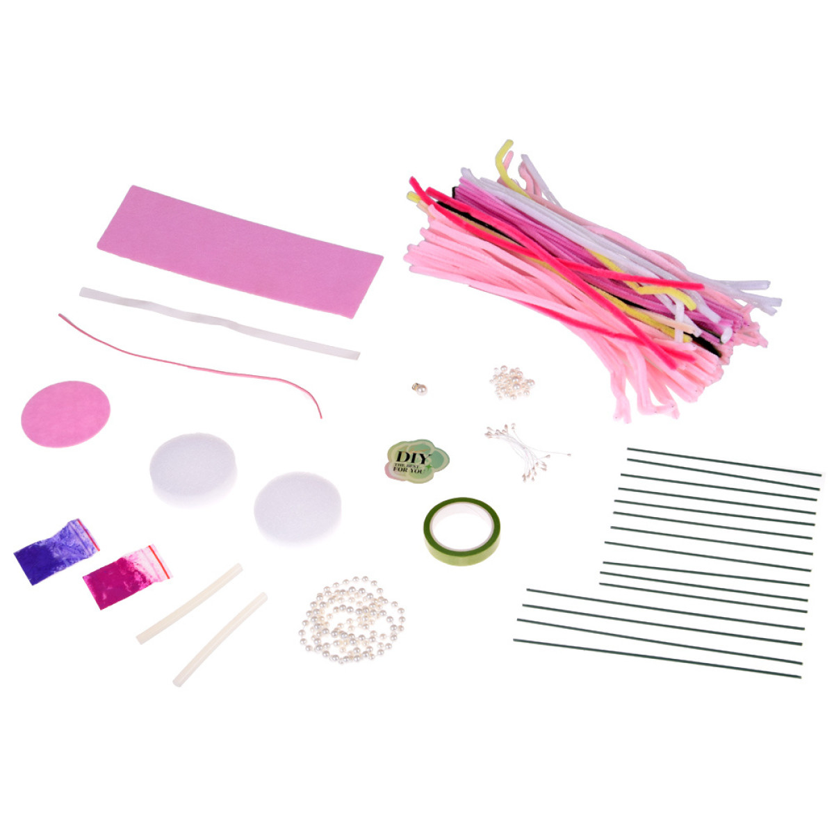 Izveidojiet savu romantisko ziedu kompozīciju ar šo kreatīvo DIY komplektu! Šis burvīgais komplekts ļauj pašiem izgatavot dekoratīvu pušķi no rozā ziediem, izmantojot krāsainus stieplītes, pērlītes, filcus un citus dekoratīvus papildinājumus.