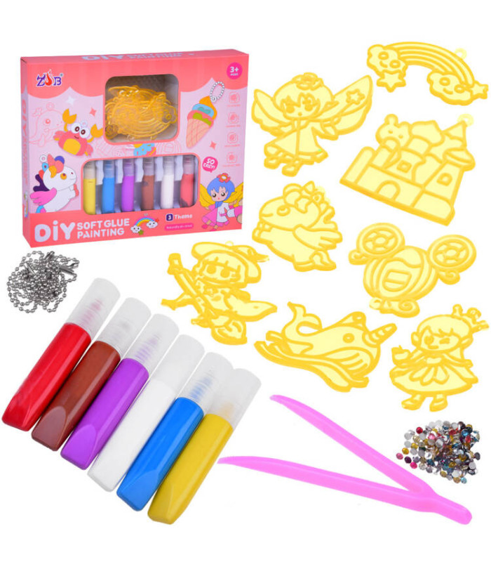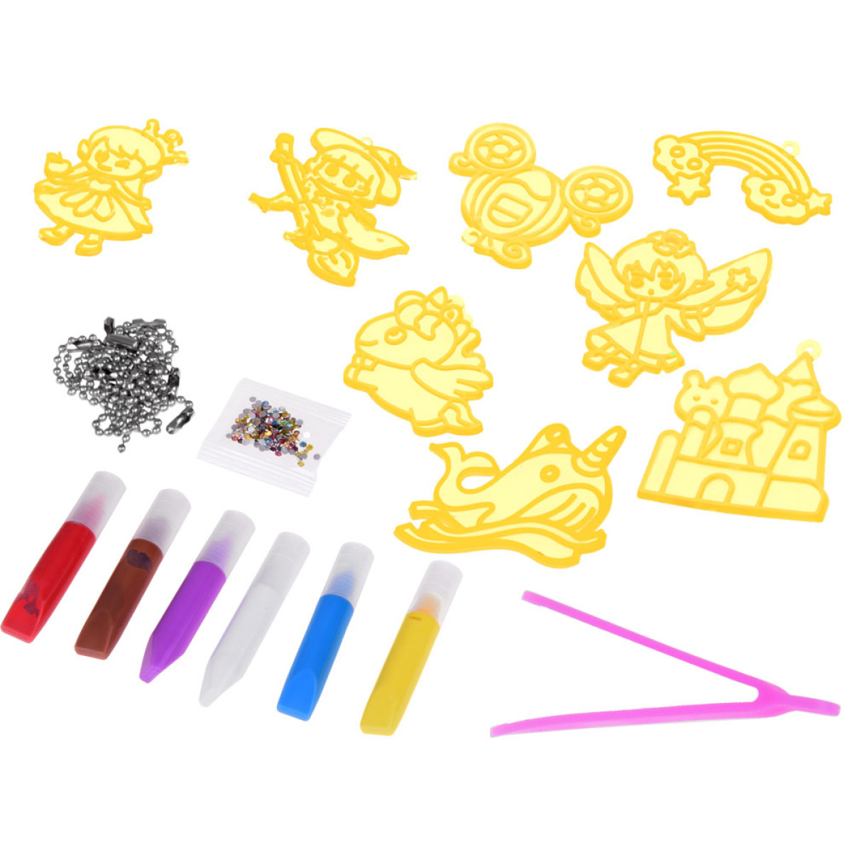 Komplektā ietilpst arī pincete, kas atvieglo kristālu pielikšanu, piešķirot katram projektam mirdzumu un burvību. Kristāli var tikt pielīmēti dažādās vietās, padarot katru darbu unikālu un īpašu. Beigās bērns var pievienot rotātos šablonus pie komplektā iekļautajām ķēdēm – tas ir lielisks veids, kā izveidot skaistas piekariņas, kuras var pakarināt istabā, pie mugursomas vai kā atslēgu piekariņu.
