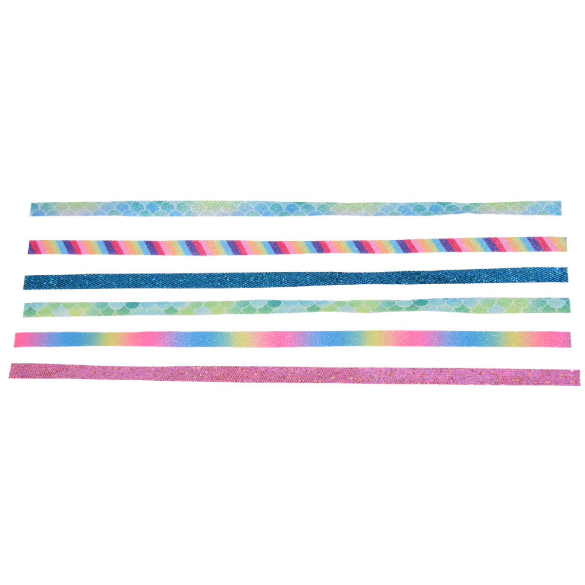 - 6 spīdīgas lentītes dažādās krāsās un rakstos,