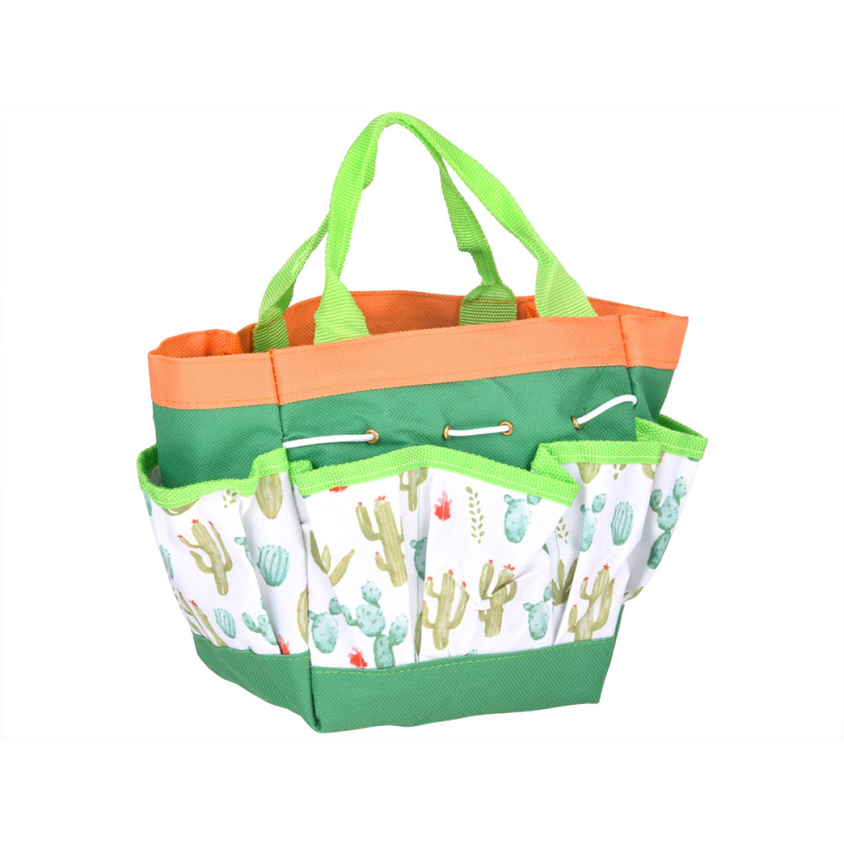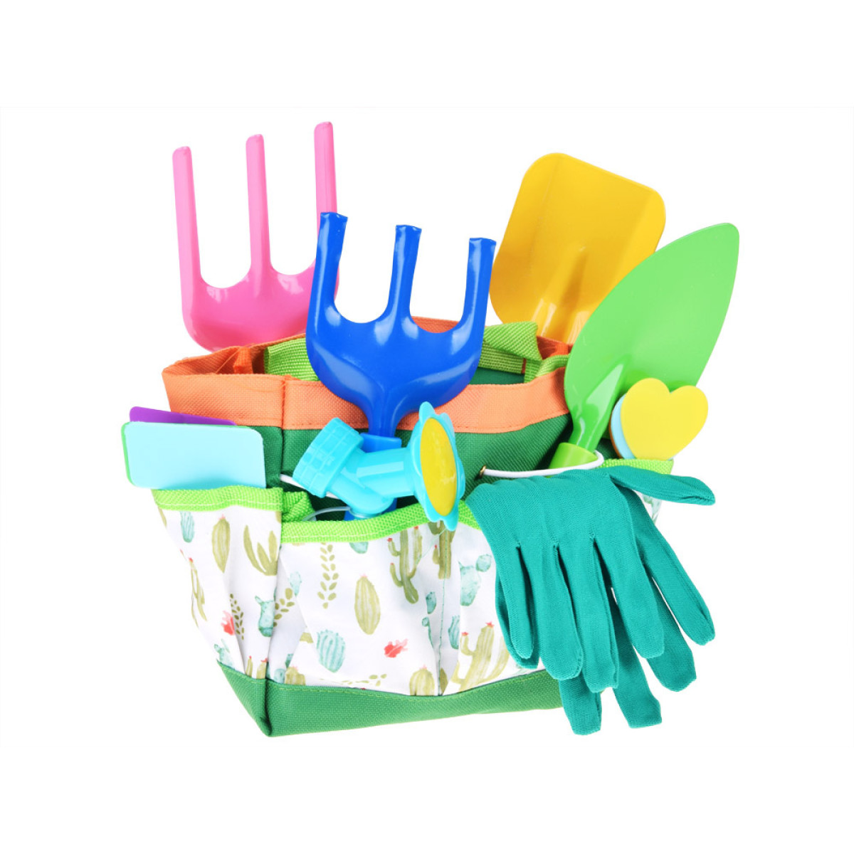 Materiālie elementi – priekšauts, ceļu aizsargi, cimdi un soma – ir izgatavoti balti-zaļā krāsā ar kaktusu un sukulentu motīvu. Soma pilda praktiska organizera funkciju ar dažādām kabatām, kur bērns var ievietot rīkus, sēklas vai mazos dārzkopības piederumus.