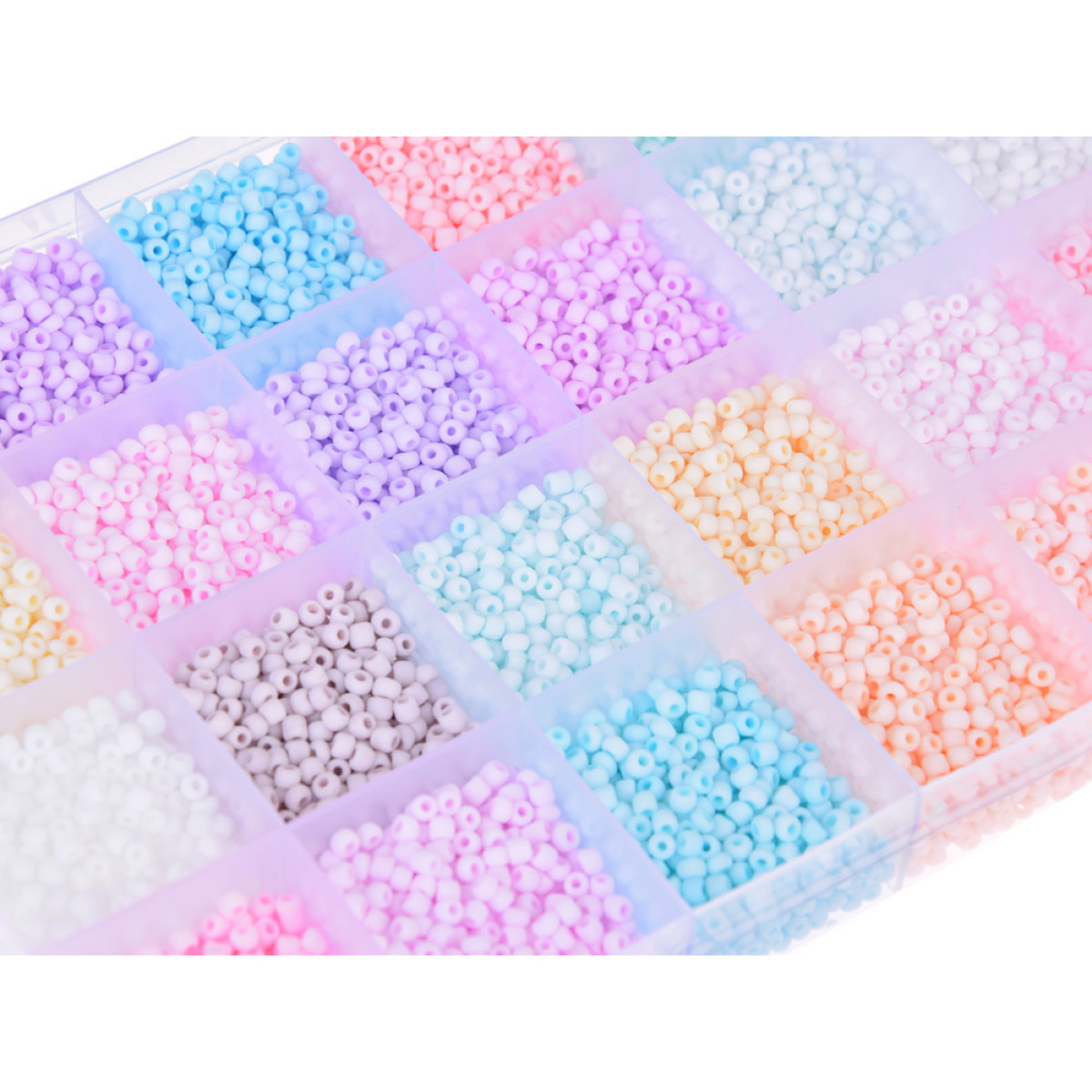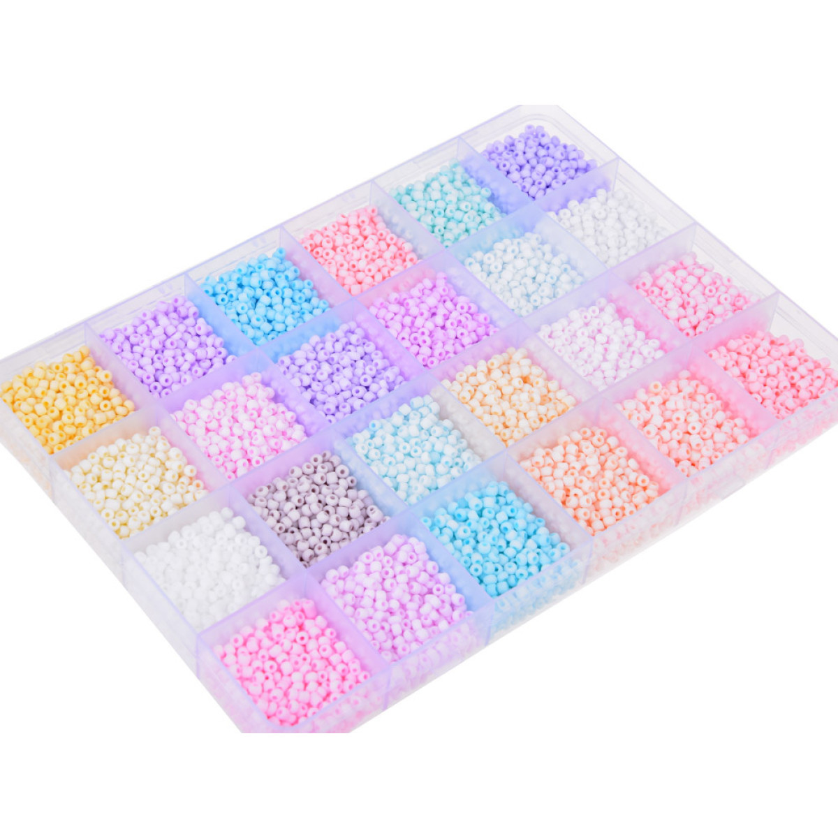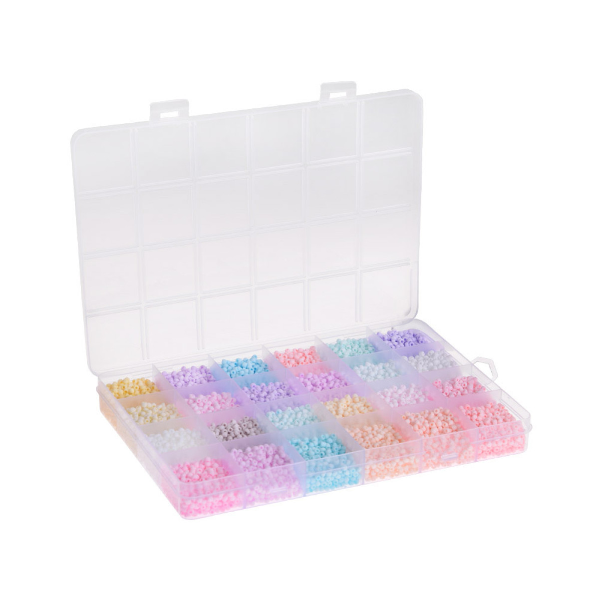 Mūsu komplektā ir 24 dažādas krellīšu krāsas pastelīgos toņos: rozā, violetā, zilā, bēšā, zaļā, baltā un dzeltenā. Tās atrodas caurspīdīgā, gareniskā iepakojumā, kas atgādina koferīti ar nodalījumiem. Tas ir ērts risinājums, jo krelles nesajaucas.