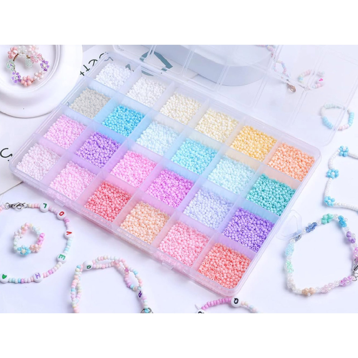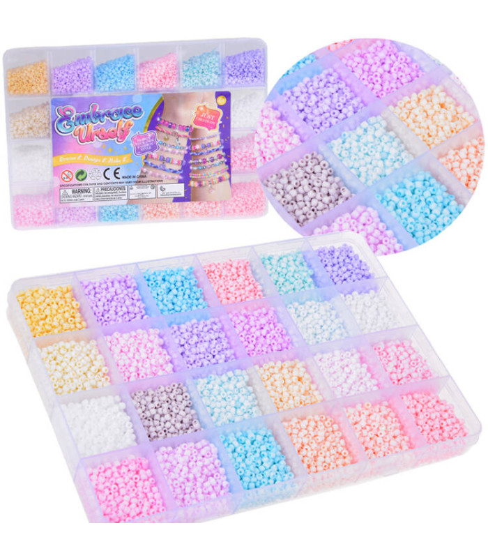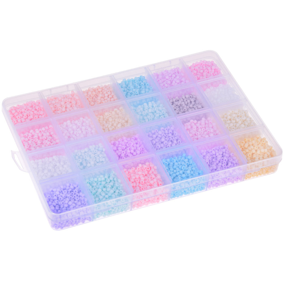 Mūsu komplektā ir 24 dažādas krellīšu krāsas pastelīgos toņos: rozā, violetā, zilā, bēšā, zaļā, baltā un dzeltenā. Tās atrodas caurspīdīgā, gareniskā iepakojumā, kas atgādina koferīti ar nodalījumiem. Tas ir ērts risinājums, jo krelles nesajaucas.