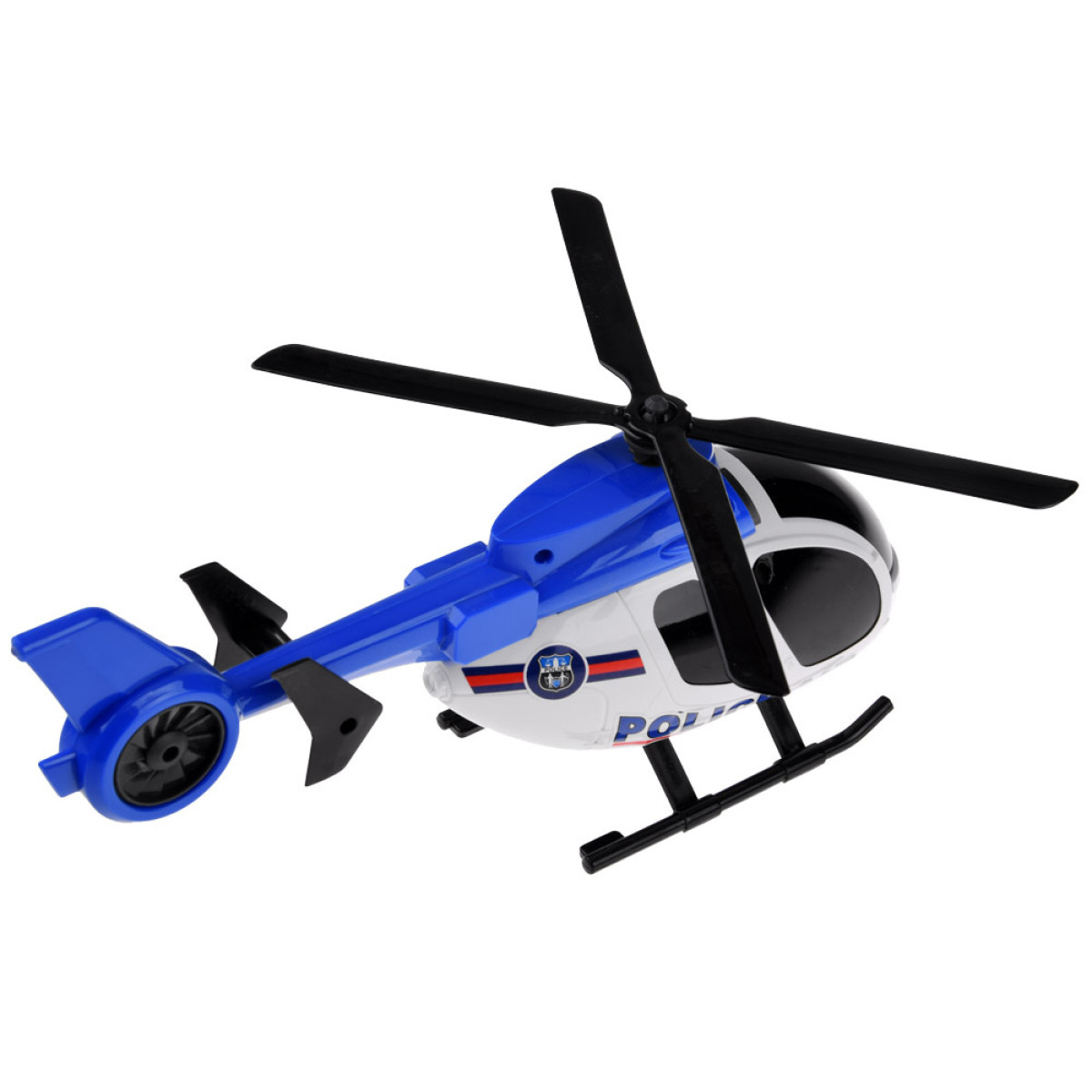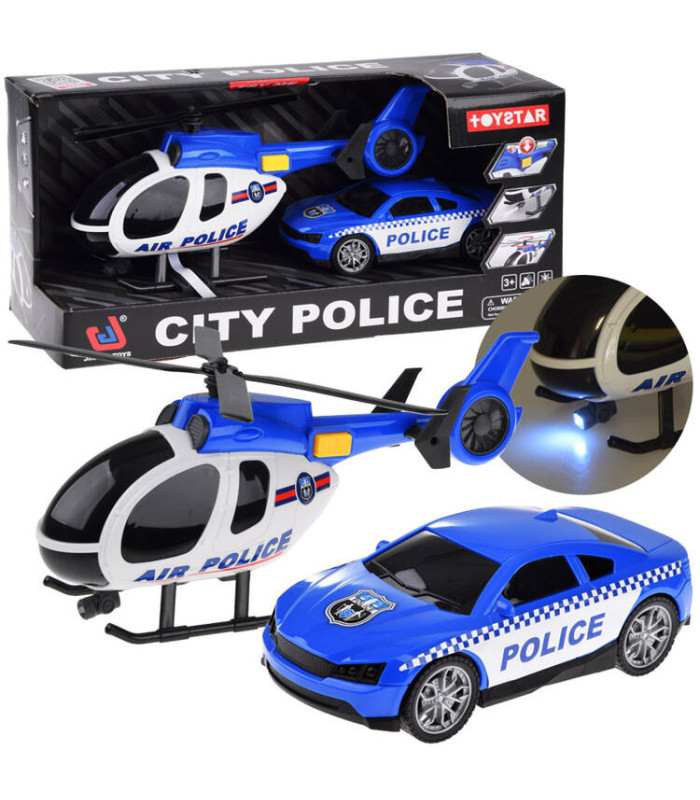 Policijas transportlīdzekļi ir ideāla izvēle mazajiem speciālo dienestu faniem. Komplektā ir iekļauts zils auto un helikopters, kas noteikti būs lielisks papildinājums jebkurai policijas operācijai. Policijas auto ir izgatavots pilnībā no plastmasas un pārvietojas uz gumijas riepām, kas ļauj tam viegli kustēties. Papildu priekšrocība ir helikopters, kas aprīkots ar skaņas efektiem un mirgojošām gaismām priekšā un aizmugurē, padarot spēli aizraujošāku. Skaņas var ieslēgt ar dzelteno pogu helikoptera augšējā daļā. Pēc pogas nospiešanas atskanēs helikoptera darba skaņas un sirēnas skaņa.