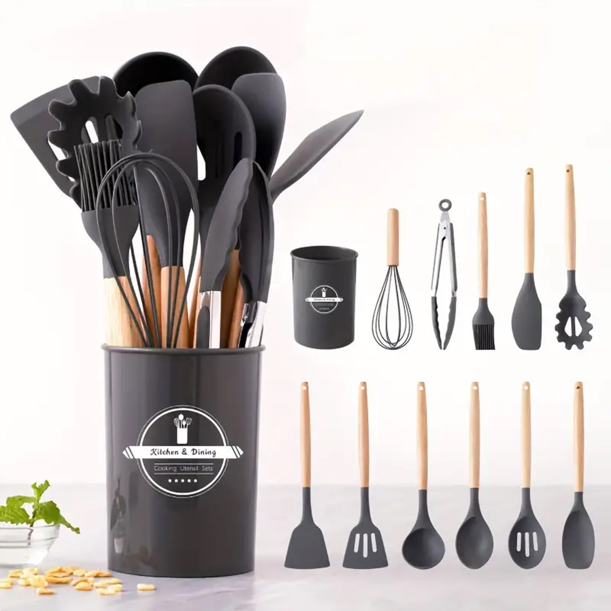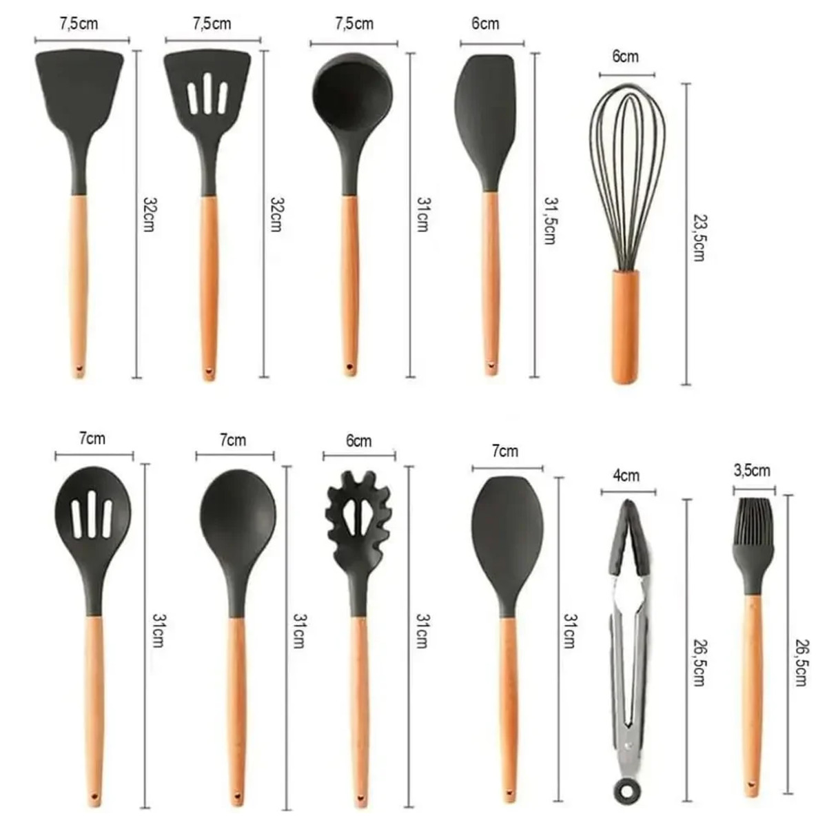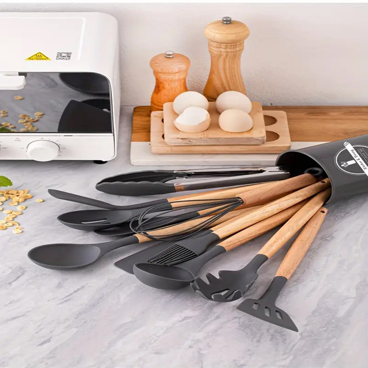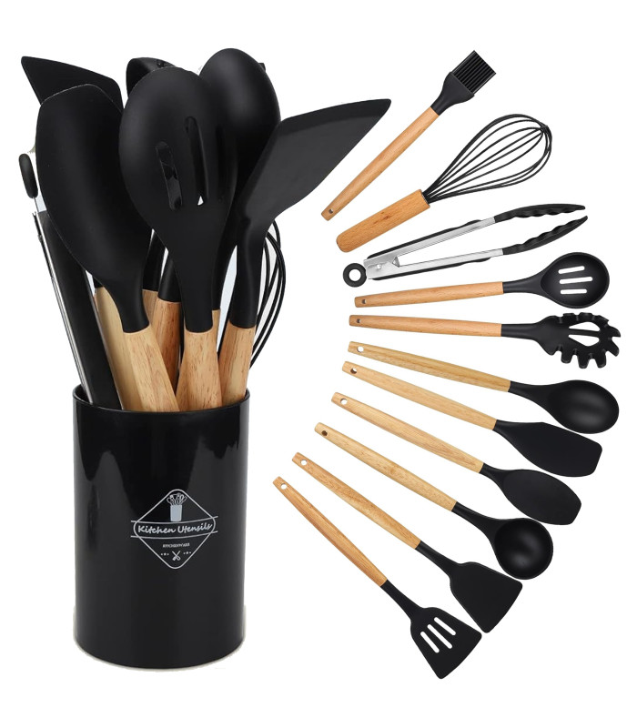 Virtuves piederumu komplekts no silikona un koka, 12 daļas