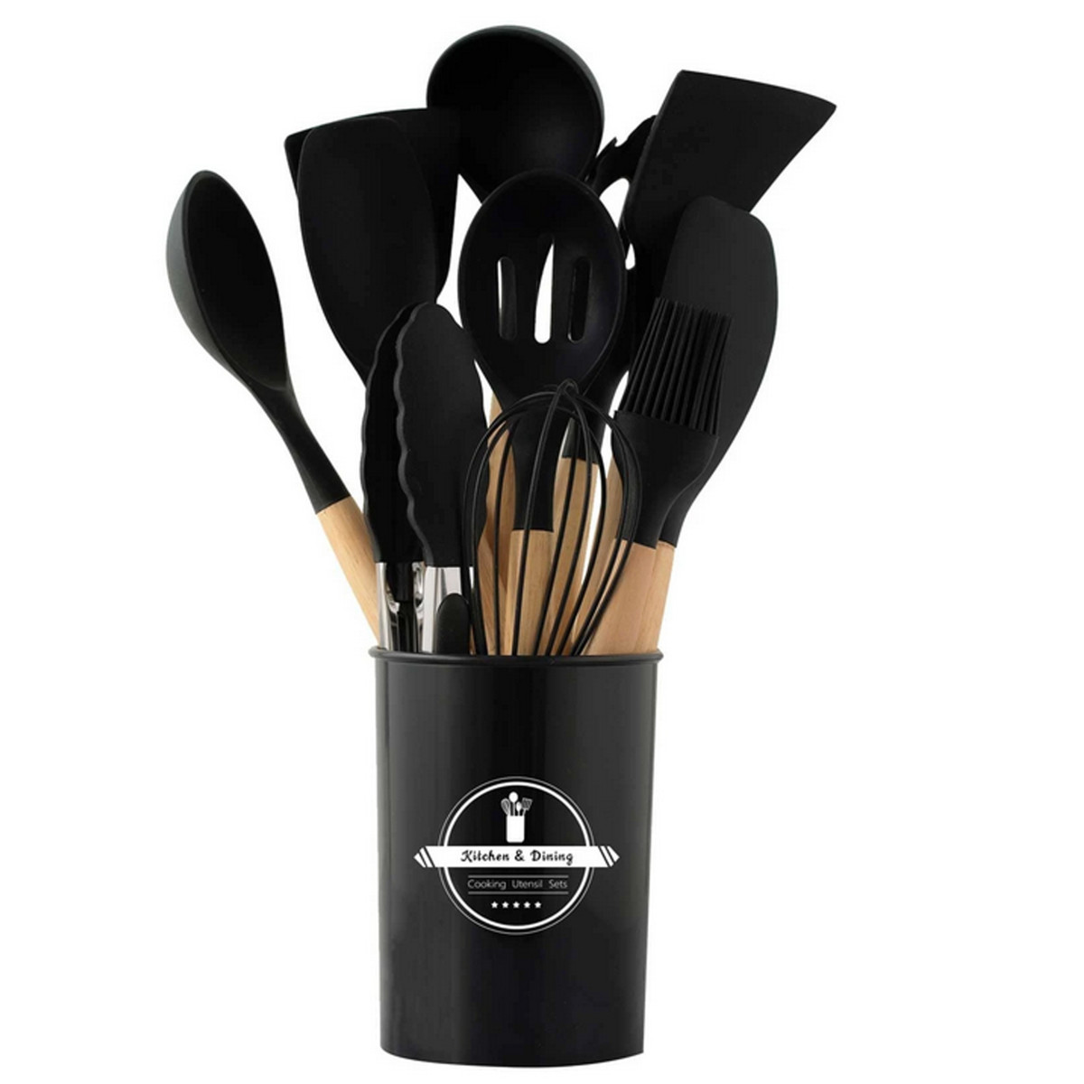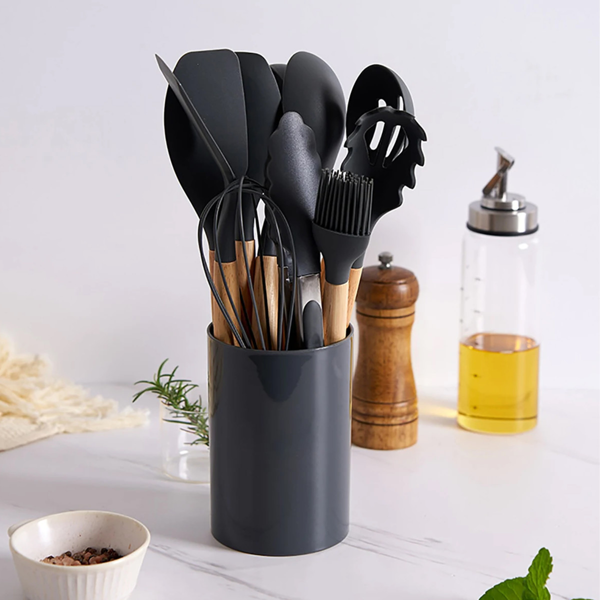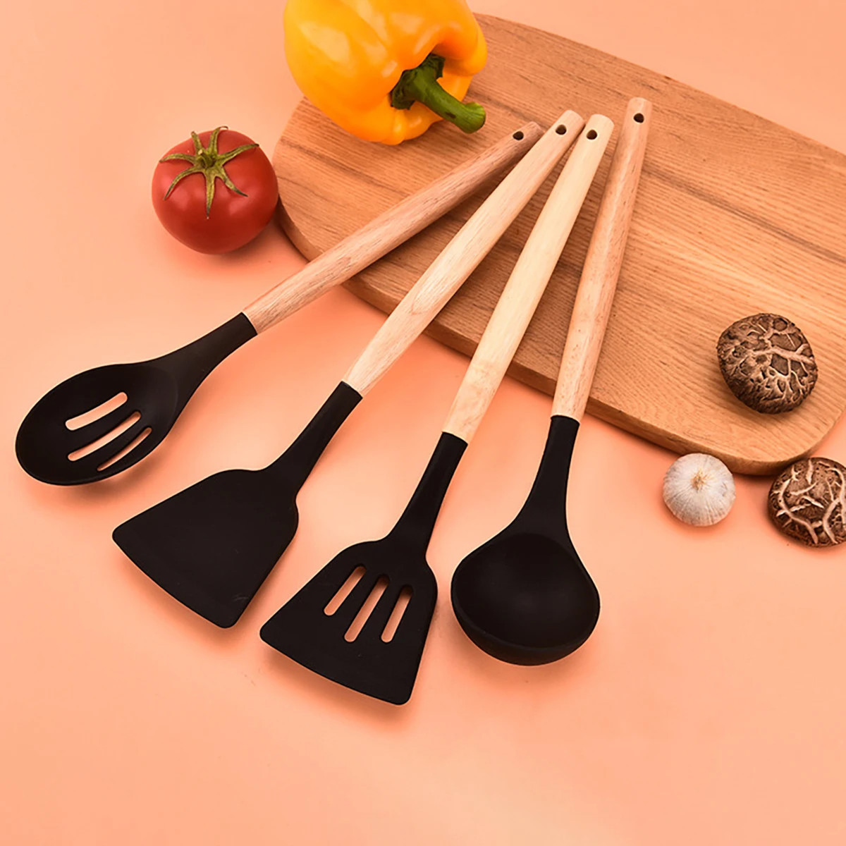 Virtuves piederumu komplekts no silikona un koka, 12 daļas