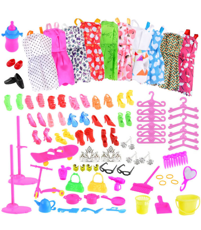 Lelles kleitu apavu aksesuāru komplekts ir daudzdaļīgs komplekts, kas sastāv no krāsainām, kokteiļkleitām, daudz apavu, rotaslietām, somiņām un nelielām sadzīves tehnikas ierīcēm, kas noteikti iepriecinās jebkuru mazo modes veidotāju. Komplektā ir kleitas ar lencītēm, kas ļaus leļļu tipa Barbie mainīt tērpus pēc sirds patikas, kā arī apbrīnojama apavu kolekcija dažādās krāsās un modeļos, ar papēžiem, bez papēžiem utt. Protams, stilu papildina rotaslietas un somiņa. Un šajā komplektā tas viss ir! Krāsainie plastmasas elementi ideāli derēs lellēm apmēram 30 cm augstumā, Anlily, Barbie tipa augumiem.