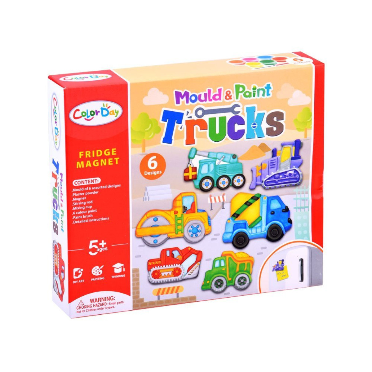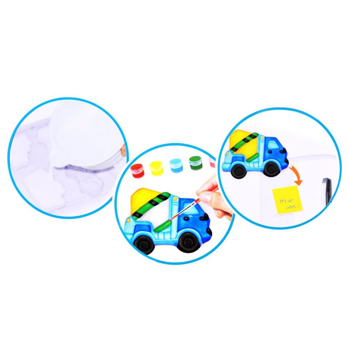 Tas ir lielisks komplekts radošai spēlei magnētu veidošanai ledusskapim būvniecības transportlīdzekļu formā: buldozers, celtnis, betona maisītājs, veltnis, ekskavators un kravas automašīna.