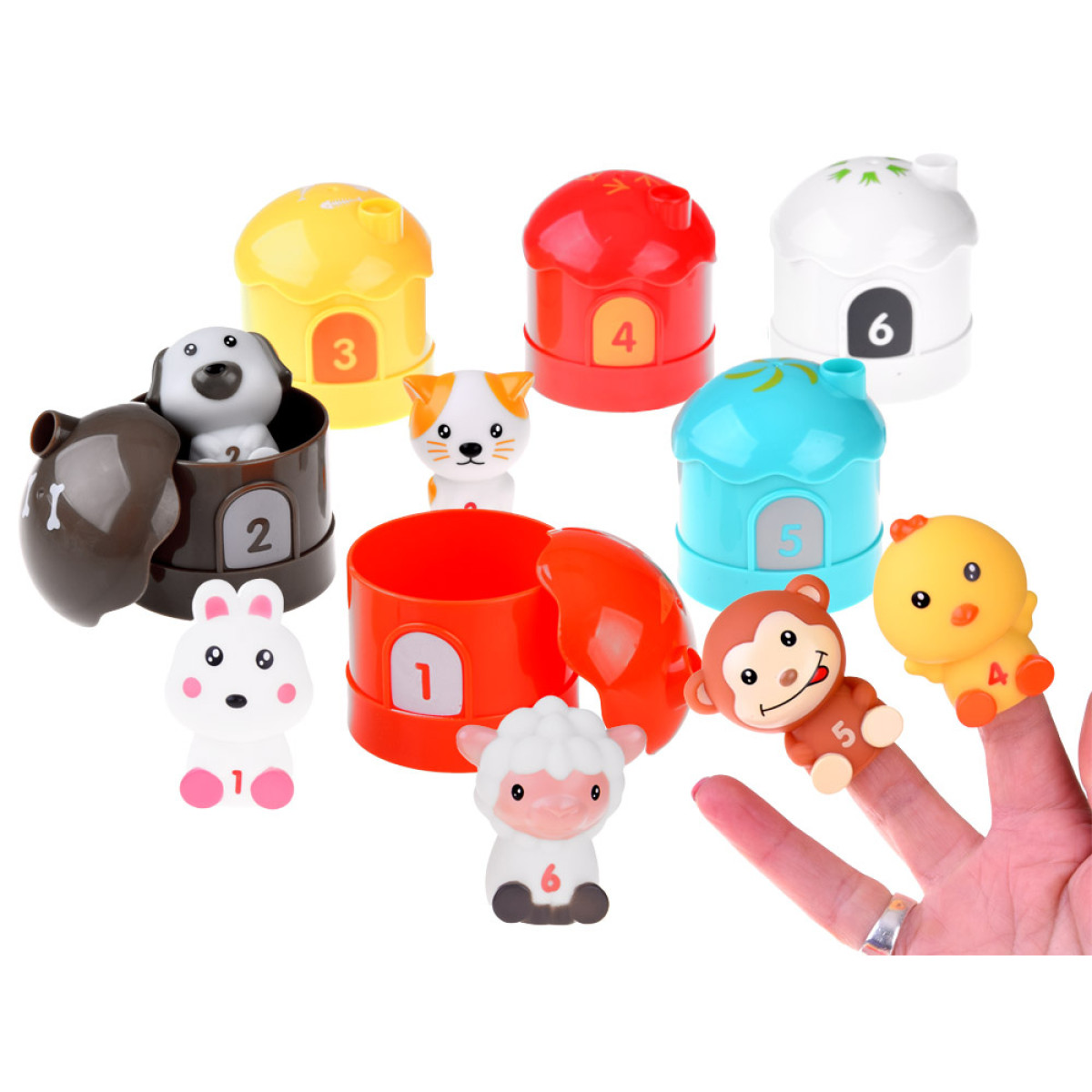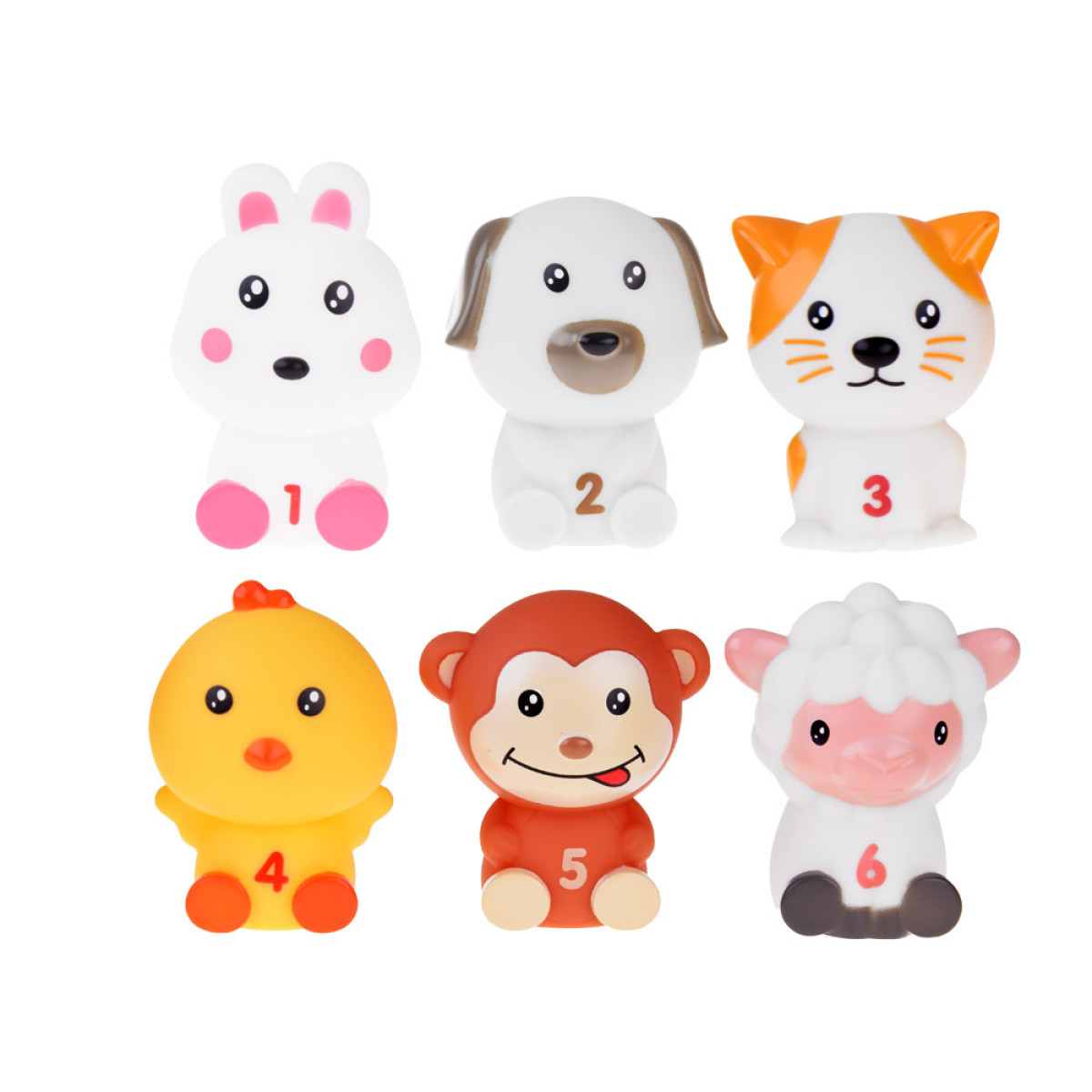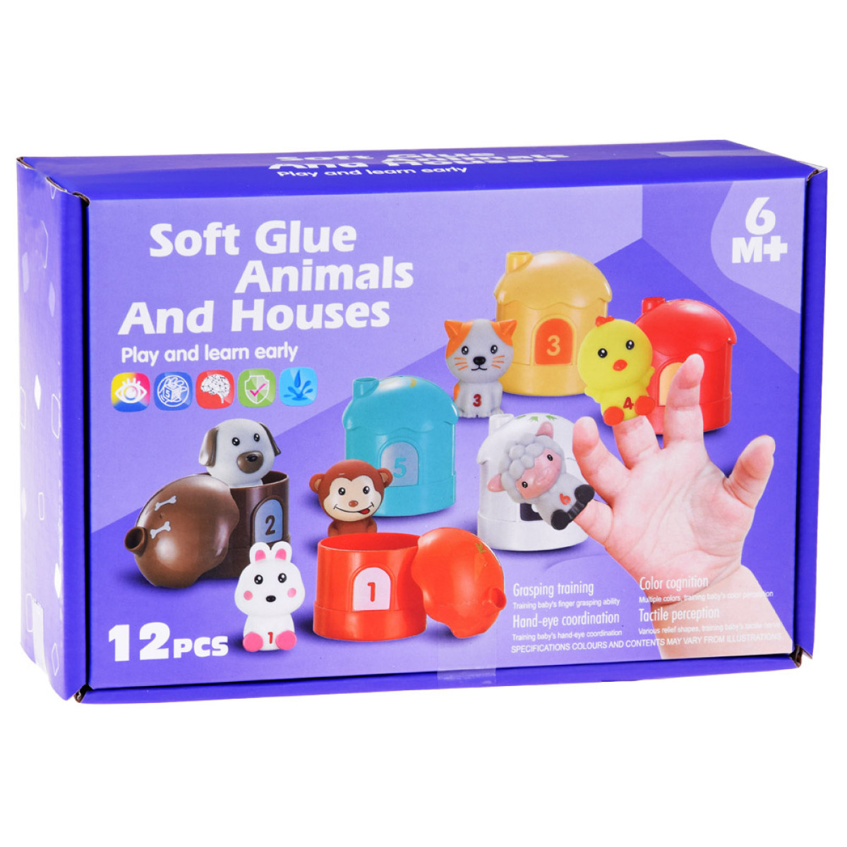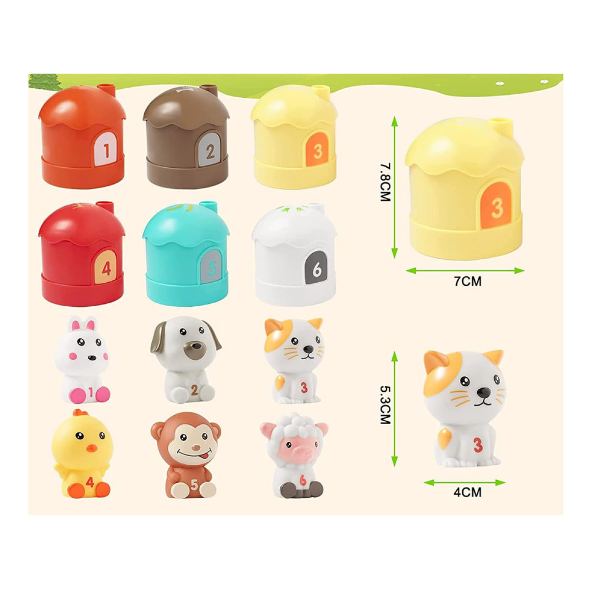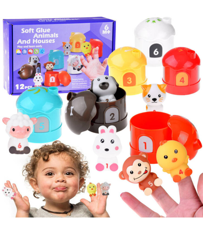 Gumijas dzīvnieciņu komplekts ir ideāls rotaļām teātrī, skaitīšanas apguvei, kā arī jautrām peldēm vannā. Dzīvnieciņi dzīvo katrs savā mājiņā, kuras ir apaļas ar atveramu jumtu, un uz katras mājiņas ir cipars. Katrai gumijas figūriņai ir cipars uz vēdera un caurums apakšā, kas ļauj to izmantot teātra spēlēm.