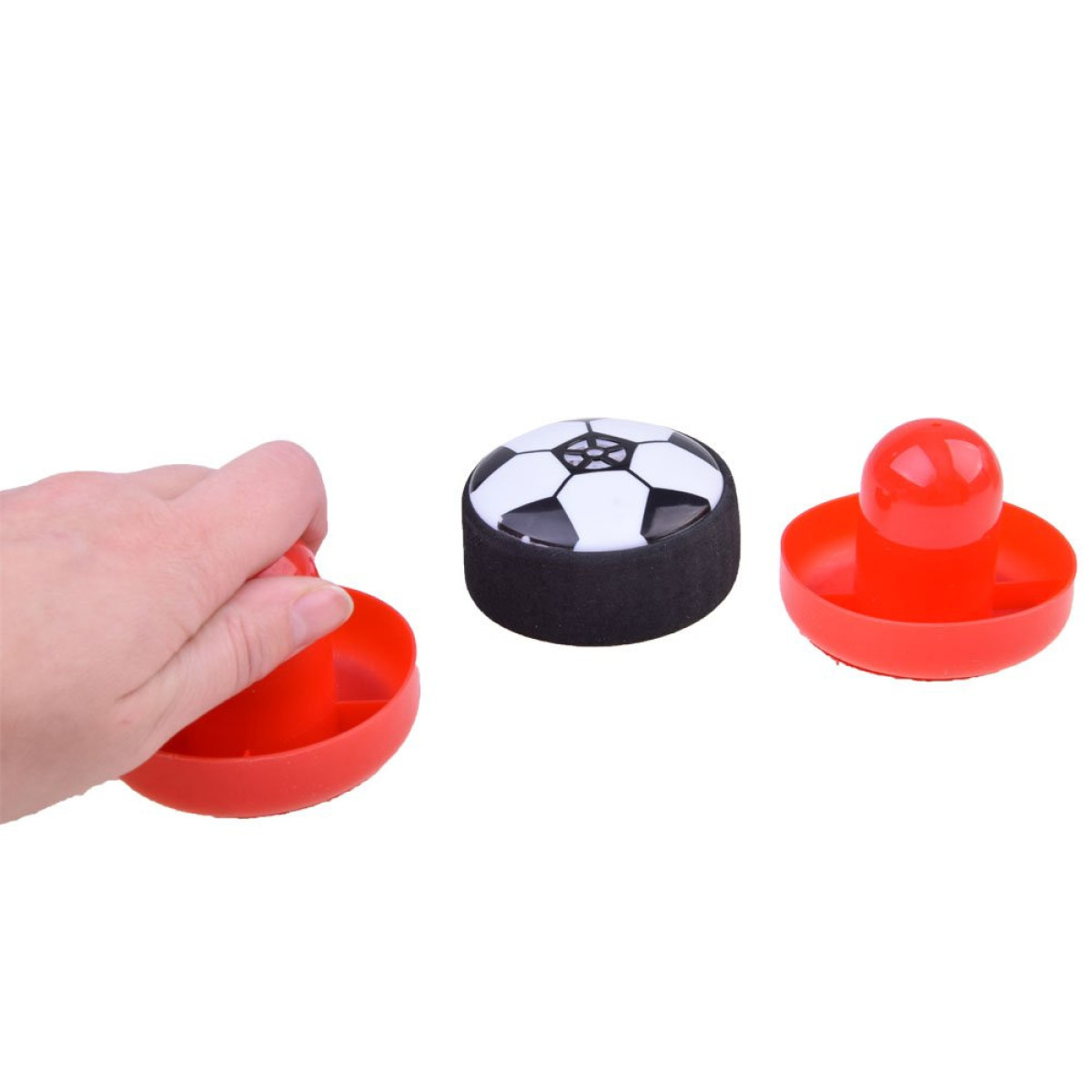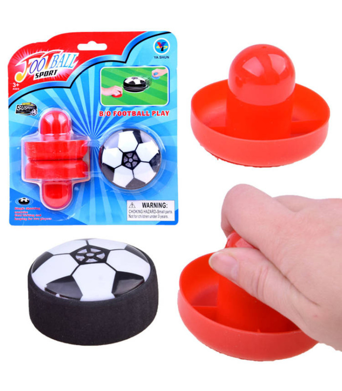 Vienkārši izveido vārtus, piemēram, no grāmatām vai citiem priekšmetiem, un spēli var sākt. Disks ir melnbaltā krāsā ar putu malu, un pēc 2 x 1,5V AAA bateriju ievietošanas tas sāk pacelties. Sarkanie atsitiena kauliņi ir izgatavoti no plastmasas ar auduma apakšu, lai nodrošinātu labāku un vieglāku slīdēšanu.